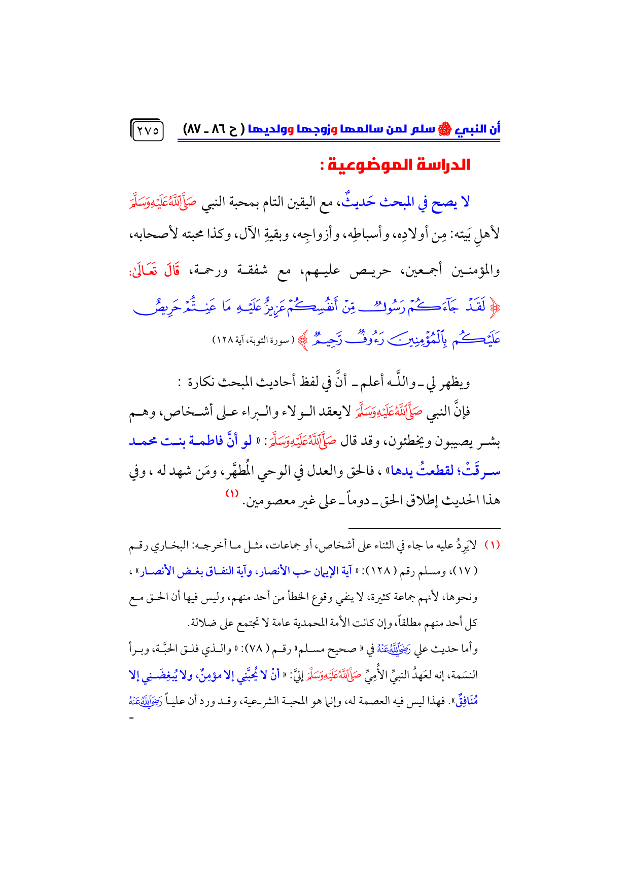 فإنَّ النبي - صلى الله عليه وسلم - لايعقد الولاء والبراء على أشخاص، وهم بشر يصيبون ويخطئون، وقد قال - صلى الله عليه وسلم -: «لو أنَّ فاطمة بنت محمد سرقَتْ؛ لقطعتُ يدها»، فالحق والعدل في الوحي المُطهَّر، ومَن شهد له، وفي هذا الحديث إطلاق الحق ـ دوماً ـ على غير معصومين. (¬١)