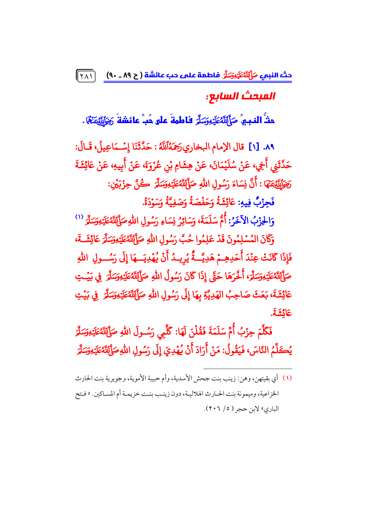 ٨٩. [١] قال الإمام البخاري - رحمه الله -: حَدَّثَنَا إِسْمَاعِيلُ، قَالَ: حَدَّثَنِي أَخِي، عَنْ سُلَيْمَانَ، عَنْ هِشَامِ بْنِ عُرْوَةَ، عَنْ أَبِيهِ، عَنْ عَائِشَةَ - رضي الله عنها -: أَنَّ نِسَاءَ رَسُولِ اللهِ - صلى الله عليه وسلم - كُنَّ حِزْبَيْنِ: