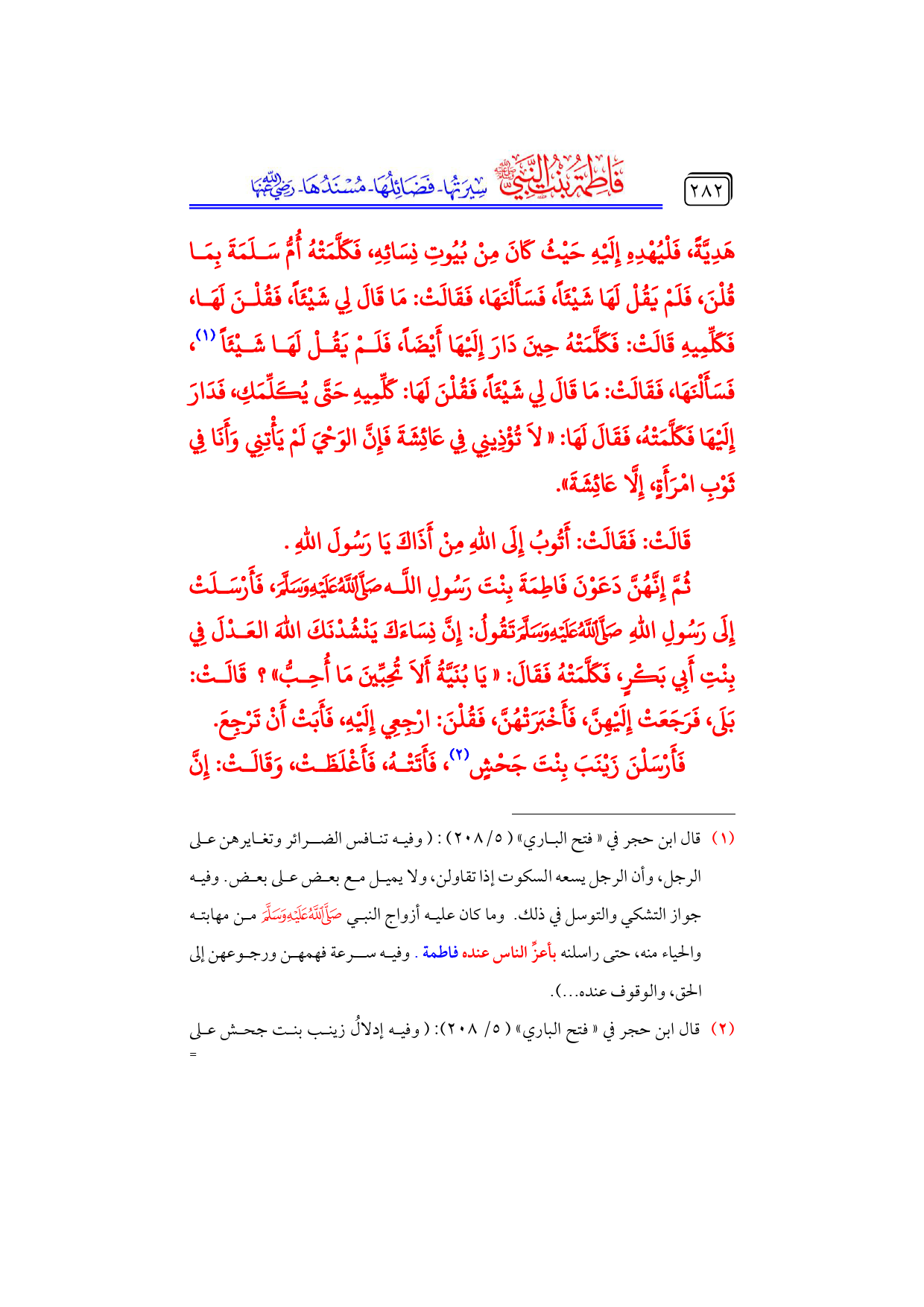 ثُمَّ إِنَّهُنَّ دَعَوْنَ فَاطِمَةَ بِنْتَ رَسُولِ اللَّه - صلى الله عليه وسلم -، فَأَرْسَلَتْ إِلَى رَسُولِ اللهِ - صلى الله عليه وسلم - تَقُولُ: إِنَّ نِسَاءَكَ يَنْشُدْنَكَ اللهَ العَدْلَ فِي بِنْتِ أَبِي بَكْرٍ، فَكَلَّمَتْهُ فَقَالَ: «يَا بُنَيَّةُ أَلا تُحِبِّينَ مَا أُحِبُّ»؟ قَالَتْ: بَلَى، فَرَجَعَتْ إِلَيْهِنَّ، فَأَخْبَرَتْهُنَّ، فَقُلْنَ: ارْجِعِي إِلَيْهِ، فَأَبَتْ أَنْ تَرْجِعَ.