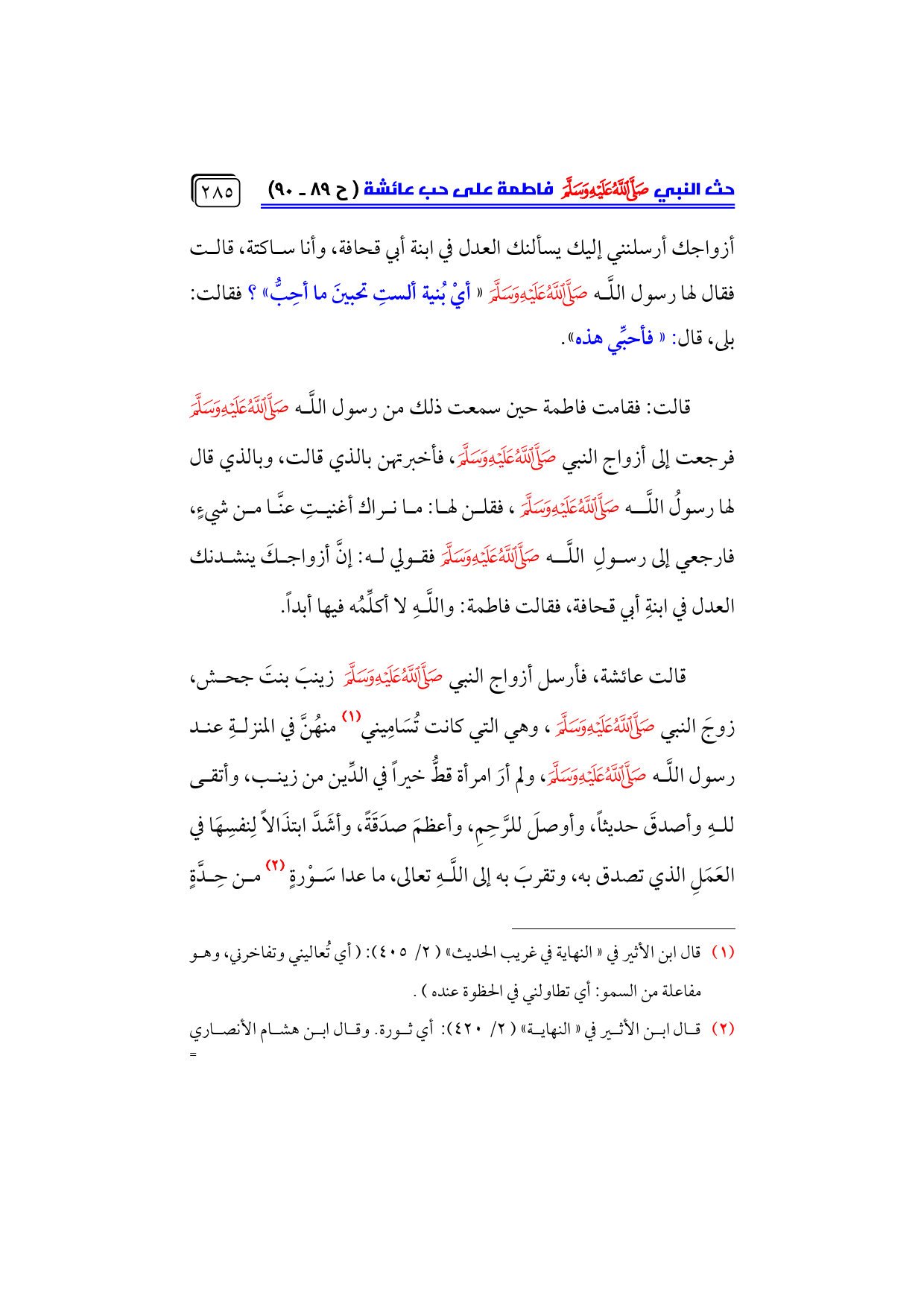أزواجك أرسلنني إليك يسألنك العدل في ابنة أبي قحافة، وأنا ساكتة، قالت فقال لها رسول اللَّه - صلى الله عليه وسلم - «أيْ بُنية ألستِ تحبينَ ما أحِبُّ»؟ فقالت: بلى، قال: «فأحبِّي هذه».