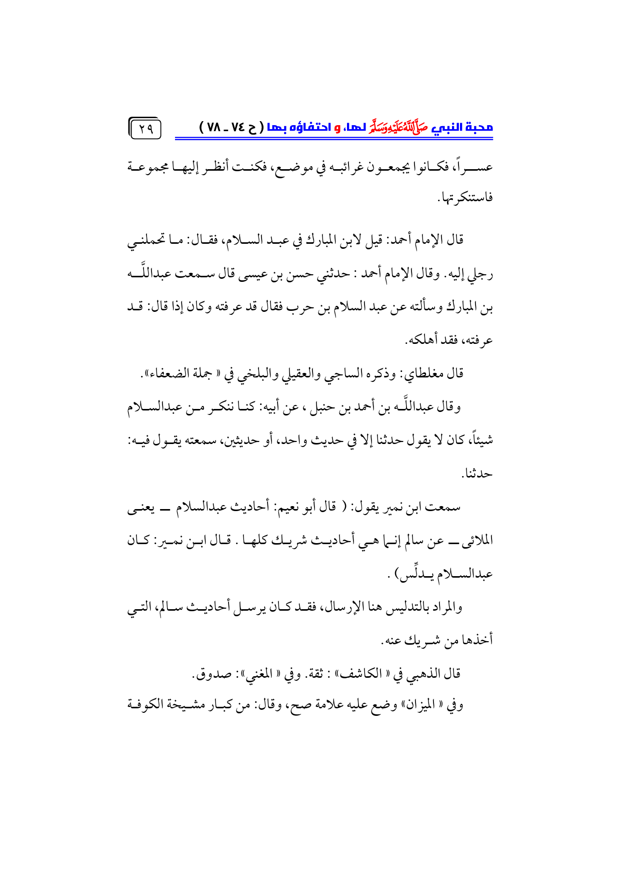 سمعت ابن نمير يقول: (قال أبو نعيم: أحاديث عبدالسلام ــ يعنى الملائى ــ عن سالم إنما هي أحاديث شريك كلها. قال ابن نمير: كان ... عبدالسلام يدلِّس). ...