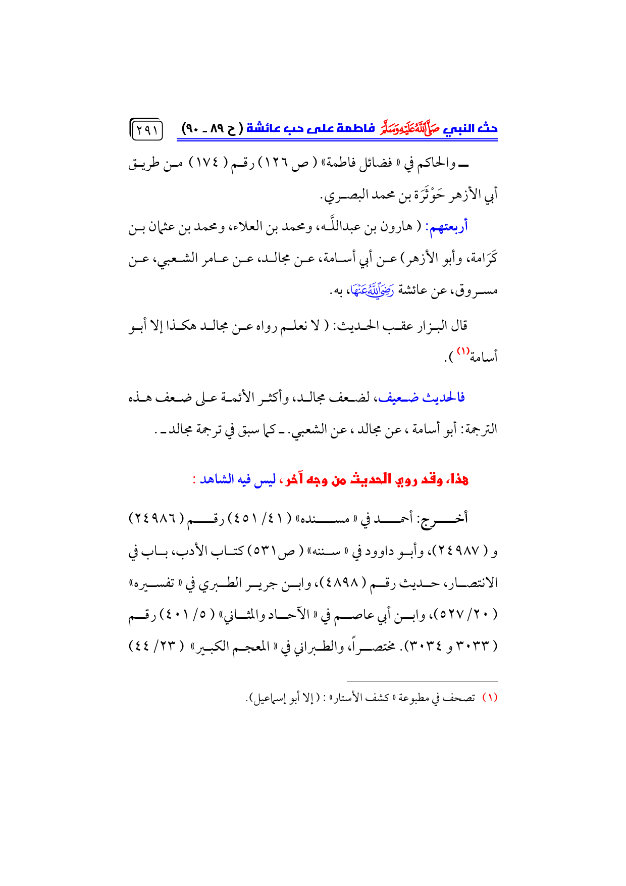 أربعتهم: (هارون بن عبداللَّه، ومحمد بن العلاء، ومحمد بن عثمان بن كَرَامة، وأبو الأزهر) عن أبي أسامة، عن مجالد، عن عامر الشعبي، عن مسروق، عن عائشة - رضي الله عنها -، به.