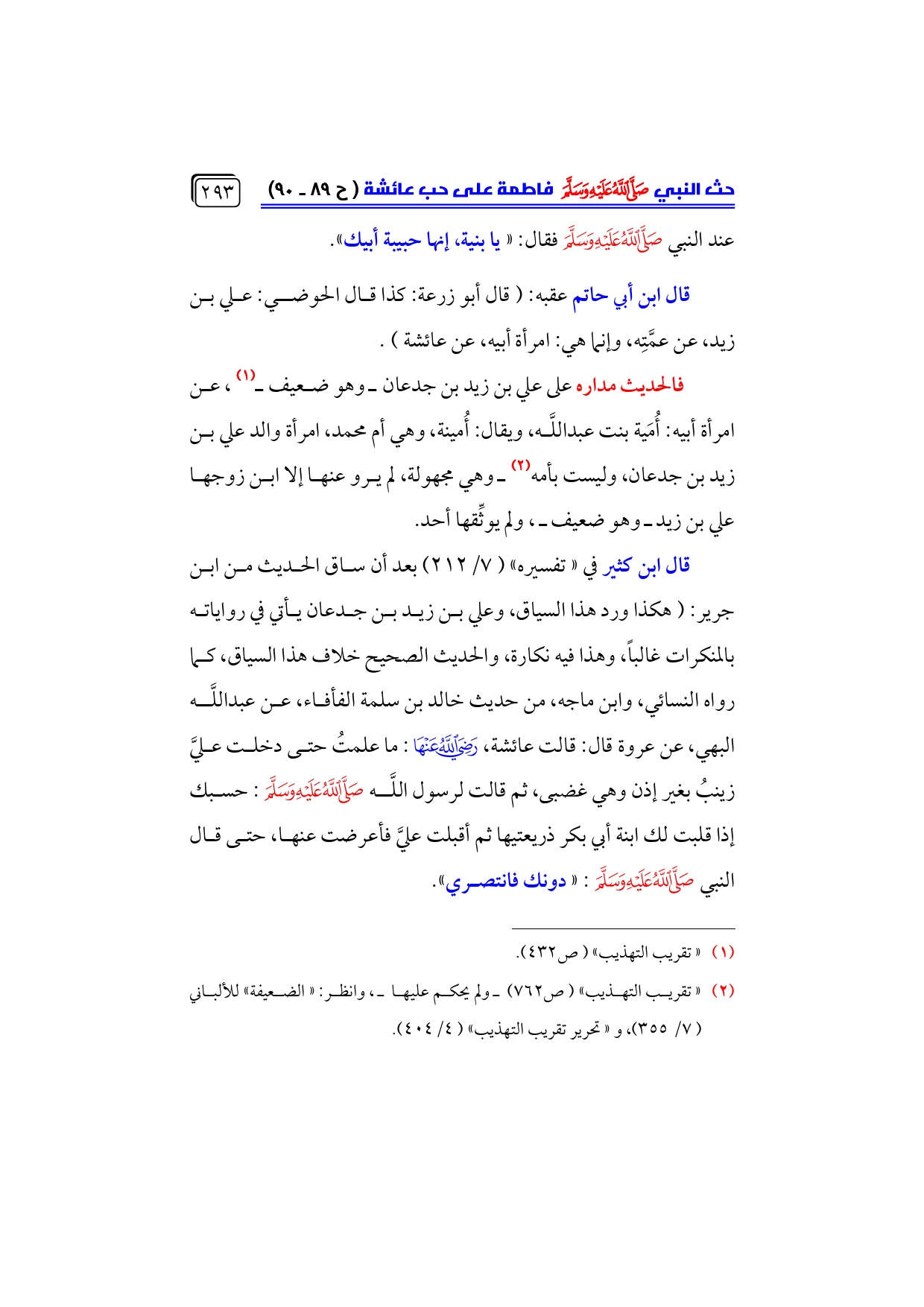 قال ابن كثير في «تفسيره» (٧/ ٢١٢) بعد أن ساق الحديث من ابن جرير: (هكذا ورد هذا السياق، وعلي بن زيد بن جدعان يأتي في رواياته بالمنكرات غالباً، وهذا فيه نكارة، والحديث الصحيح خلاف هذا السياق، كما رواه النسائي، وابن ماجه، من حديث خالد بن سلمة الفأفاء، عن عبداللَّه البهي، عن عروة قال: قالت عائشة، - رضي الله عنها -: ما علمتُ حتى دخلت عليَّ زينبُ بغير إذن وهي غضبى، ثم قالت لرسول اللَّه - صلى الله عليه وسلم -: حسبك إذا قلبت لك ابنة أبي بكر ذريعتيها ثم أقبلت عليَّ فأعرضت عنها، حتى قال النبي - صلى الله عليه وسلم -: «دونك فانتصري».