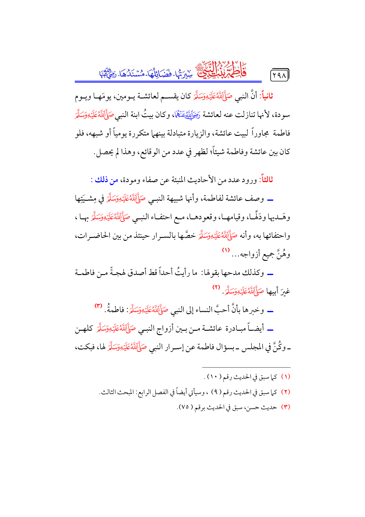 ثانياً: أنَّ النبي - صلى الله عليه وسلم - كان يقسم لعائشة يومين، يومَها ويوم سودة، لأنها تنازلت عنه لعائشة - رضي الله عنهما -، وكان بيتُ ابنة النبي - صلى الله عليه وسلم - فاطمة مجاوراً لبيت عائشة، والزيارة متبادلة بينهما متكررة يومياً أو شبهه، فلو كان بين عائشة وفاطمة شيئاً؛ لظهر في عدد من الوقائع، وهذا لم يحصل.