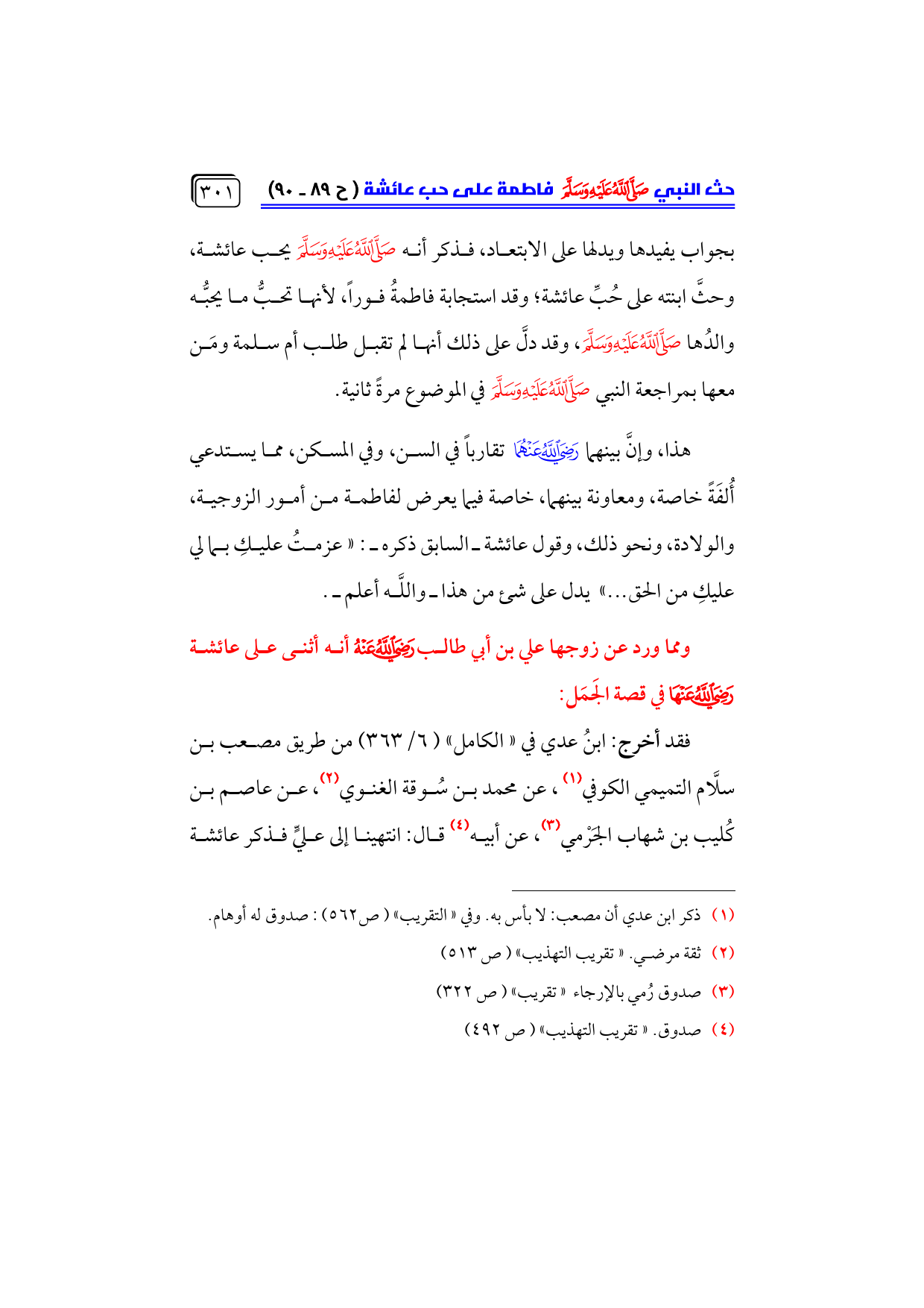 فقد أخرج: ابنُ عدي في «الكامل» (٦/ ٣٦٣) من طريق مصعب بن سلَّام التميمي الكوفي (¬١)، عن محمد بن سُوقة الغنوي (¬٢)، عن عاصم بن كُليب بن شهاب الجَرْمي (¬٣)، عن أبيه (¬٤) قال: انتهينا إلى عليٍّ فذكر عائشة