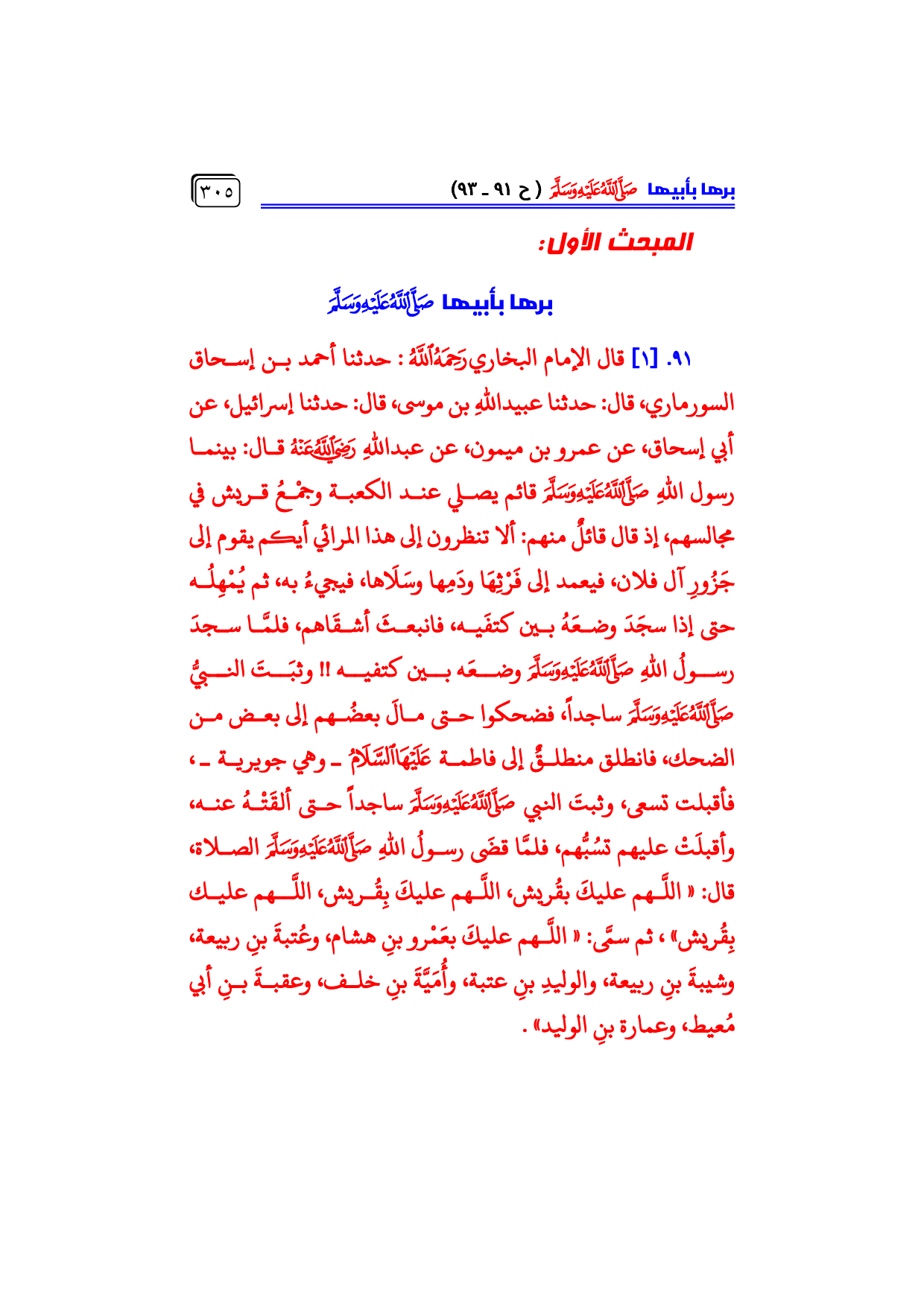 ٩١. [١] قال الإمام البخاري - رحمه الله -: حدثنا أحمد بن إسحاق السورماري، قال: حدثنا عبيداللهِ بن موسى، قال: حدثنا إسرائيل، عن أبي إسحاق، عن عمرو بن ميمون، عن عبداللهِ - رضي الله عنه - قال: بينما رسول اللهِ - صلى الله عليه وسلم - قائم يصلي عند الكعبة وجمْعُ قريش في مجالسهم، إذ قال قائلٌ منهم: ألا تنظرون إلى هذا المرائي أيكم يقوم إلى جَزُورِ آل فلان، فيعمد إلى فَرْثِهَا ودَمِها وسَلَاها، فيجيءُ به، ثم يُمْهِلُه حتى إذا سجَدَ وضعَهُ بين كتفَيه، فانبعثَ أشقَاهم، فلمَّا سجدَ ... رسولُ اللهِ - صلى الله عليه وسلم - وضعَه بين كتفيه! ! وثبَتَ النبيُّ - صلى الله عليه وسلم - ساجداً، فضحكوا حتى مالَ بعضُهم إلى بعض من الضحك، فانطلق منطلقٌ إلى فاطمة - عليها السلام - ـ وهي جويرية ـ، فأقبلت تسعى، وثبتَ النبي - صلى الله عليه وسلم - ساجداً حتى ألقَتْهُ عنه، وأقبلَتْ عليهم تسُبُّهم، فلمَّا قضَى رسولُ اللهِ - صلى الله عليه وسلم - الصلاة، قال: «اللَّهم عليكَ بقُريش، اللَّهم عليكَ بِقُريش، اللَّهم عليك بِقُريش»، ثم سمَّى: «اللَّهم عليكَ بعَمْرو بنِ هشام، وعُتبةَ بنِ ربيعة، وشيبةَ بنِ ربيعة، والوليدِ بنِ عتبة، وأُمَيَّةَ بنِ خلف، وعقبةَ بنِ أبي مُعيط، وعمارة بنِ الوليد».