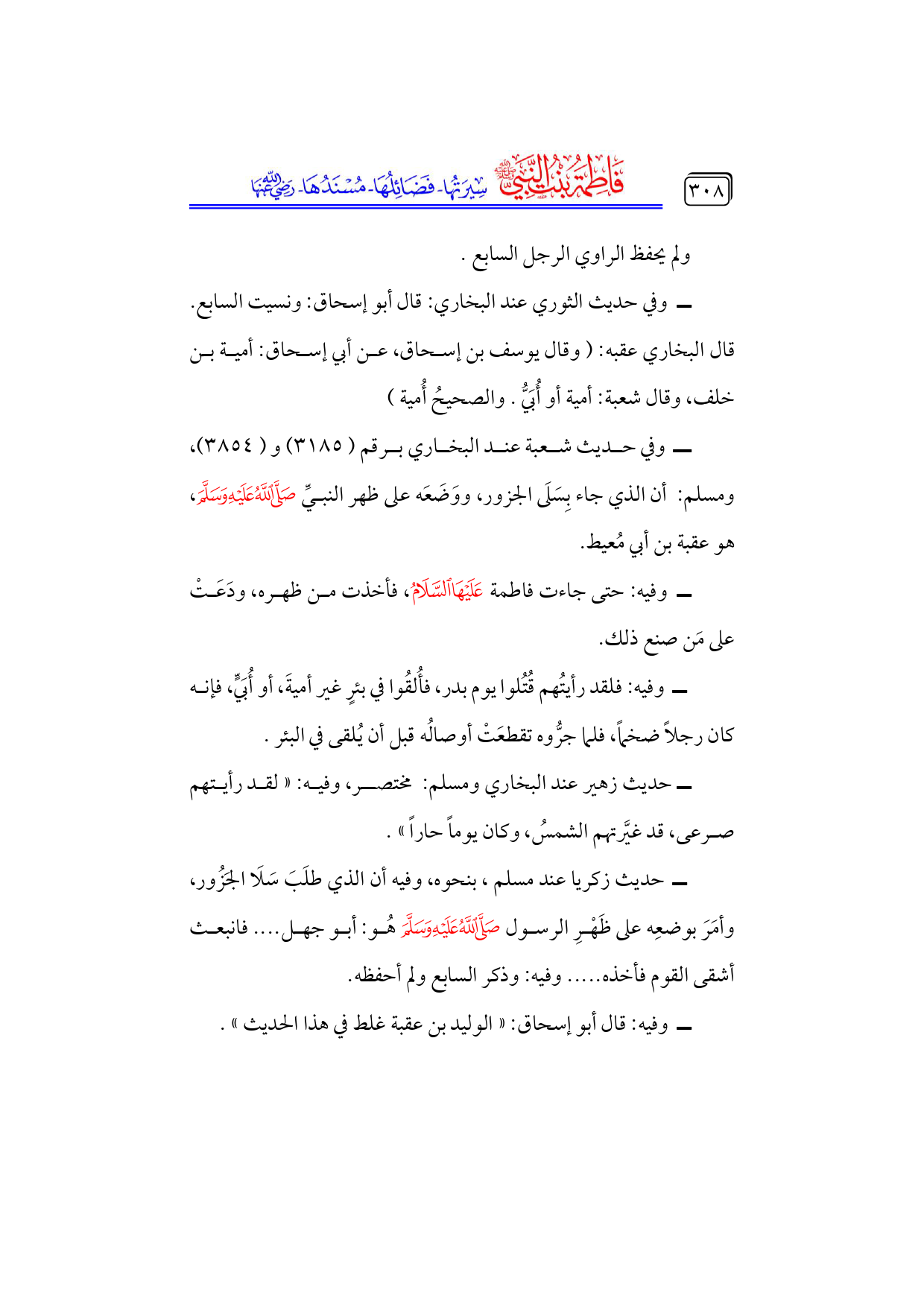 ــ وفيه: حتى جاءت فاطمة - عليها السلام -، فأخذت من ظهره، ودَعَتْ على مَن صنع ذلك.