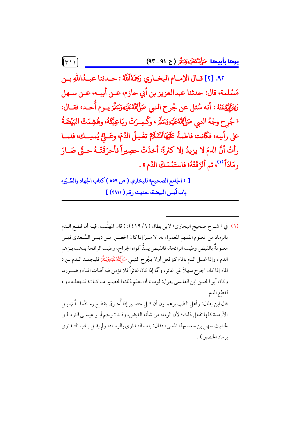 ٩٢. [٢] قال الإمام البخاري - رحمه الله -: حدثنا عبدُاللهِ بن مَسْلمة، قال: حدثنا عبدالعزيز بن أبي حازم، عن أبيه، عن سهل - رضي الله عنه -: أنه سُئل عن جُرح النبي - صلى الله عليه وسلم - يوم أُحد، فقال: ... «جُرِح وجْهُ النبي - صلى الله عليه وسلم -، وكُسِرَتْ ربَاعِيَّتُهُ، وهُشِمَتْ البَيْضَةُ على رأسِه، فكَانت فاطمةُ - عليها السلام - تغْسِلُ الدَّمَ، وعَليٌّ يُمسِك، فلما رأتْ أنَّ الدمَ لا يزيدُ إلا كثرةً، أخذَتْ حصِيراً فأحرَقَتْهُ حتَّى صَارَ رمَادَاً (¬١)، ثم ألزَقَتْهُ؛ فاستَمْسَكَ الدَّم».
