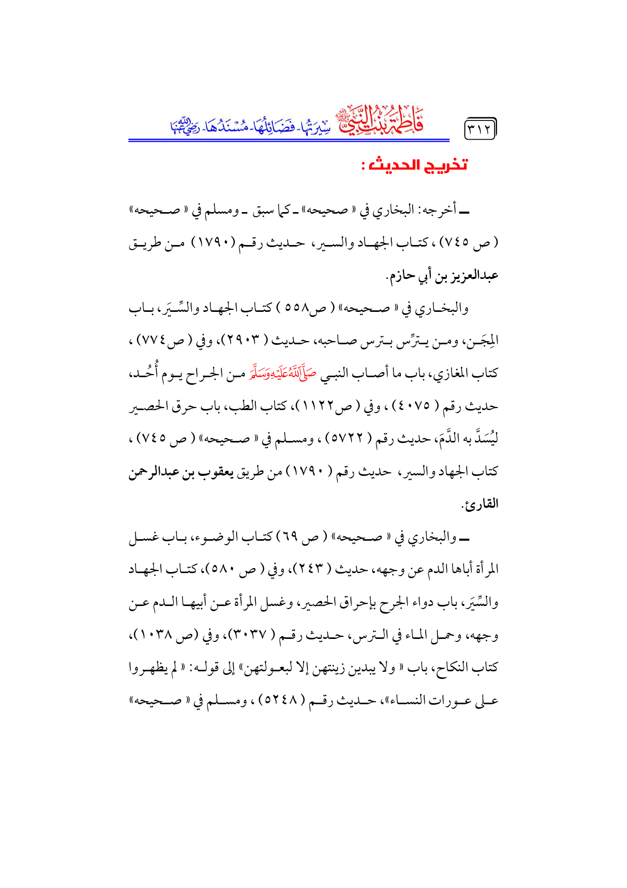 ــ والبخاري في «صحيحه» (ص ٦٩) كتاب الوضوء، باب غسل المرأة أباها الدم عن وجهه، حديث (٢٤٣)، وفي (ص ٥٨٠)، كتاب الجهاد والسِّيَر، باب دواء الجرح بإحراق الحصير، وغسل المرأة عن أبيها الدم عن وجهه، وحمل الماء في الترس، حديث رقم (٣٠٣٧)، وفي (ص ١٠٣٨)، كتاب النكاح، باب «ولا يبدين زينتهن إلا لبعولتهن» إلى قوله: «لم يظهروا على عورات النساء»، حديث رقم (٥٢٤٨)، ومسلم في «صحيحه» ...