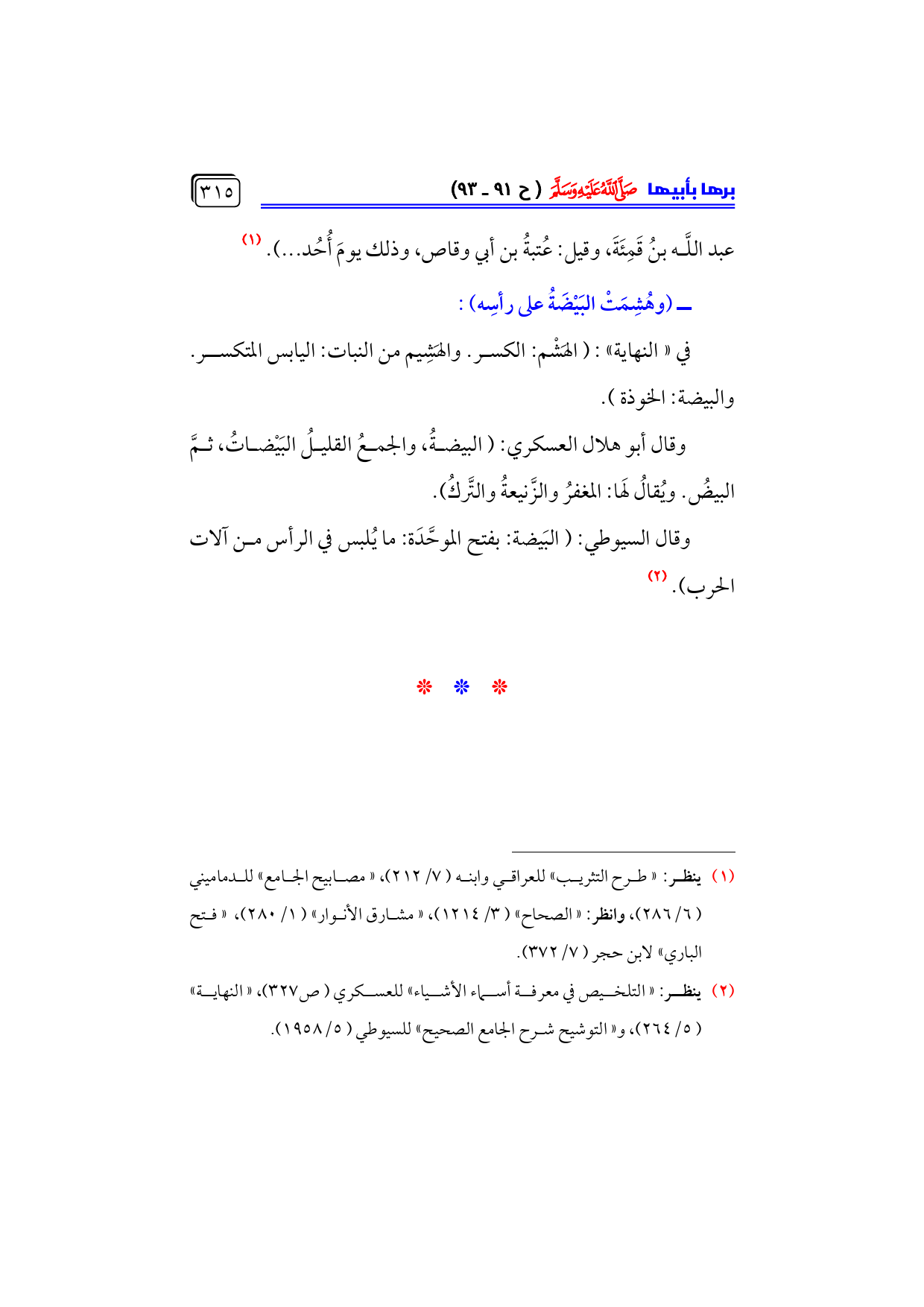 وقال السيوطي: (البَيضة: بفتح الموحَّدَة: ما يُلبس في الرأس من آلات الحرب). (¬٢)