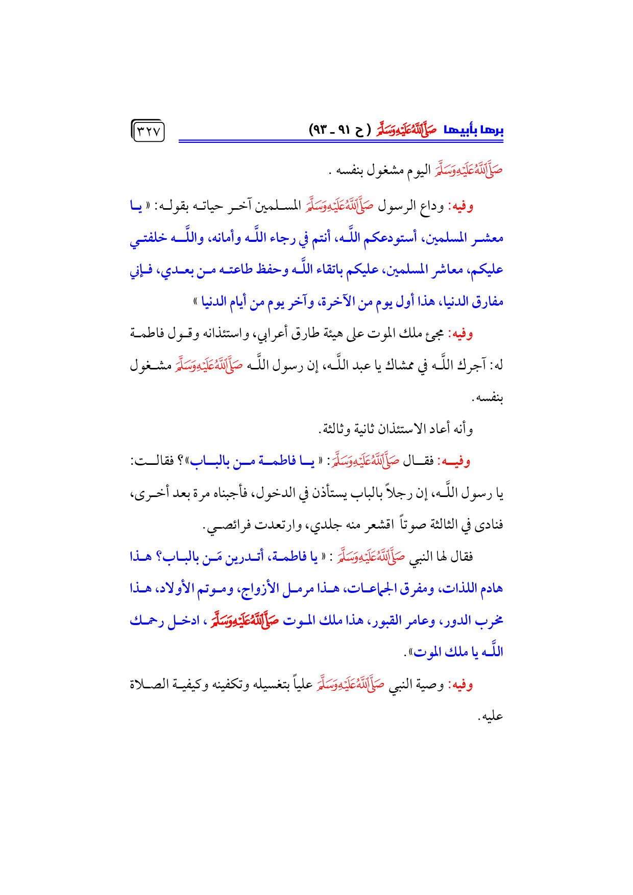 وفيه: فقال - صلى الله عليه وسلم -: «يا فاطمة من بالباب»؟ فقالت: ... يا رسول اللَّه، إن رجلاً بالباب يستأذن في الدخول، فأجبناه مرة بعد أخرى، فنادى في الثالثة صوتاً اقشعر منه جلدي، وارتعدت فرائصي.