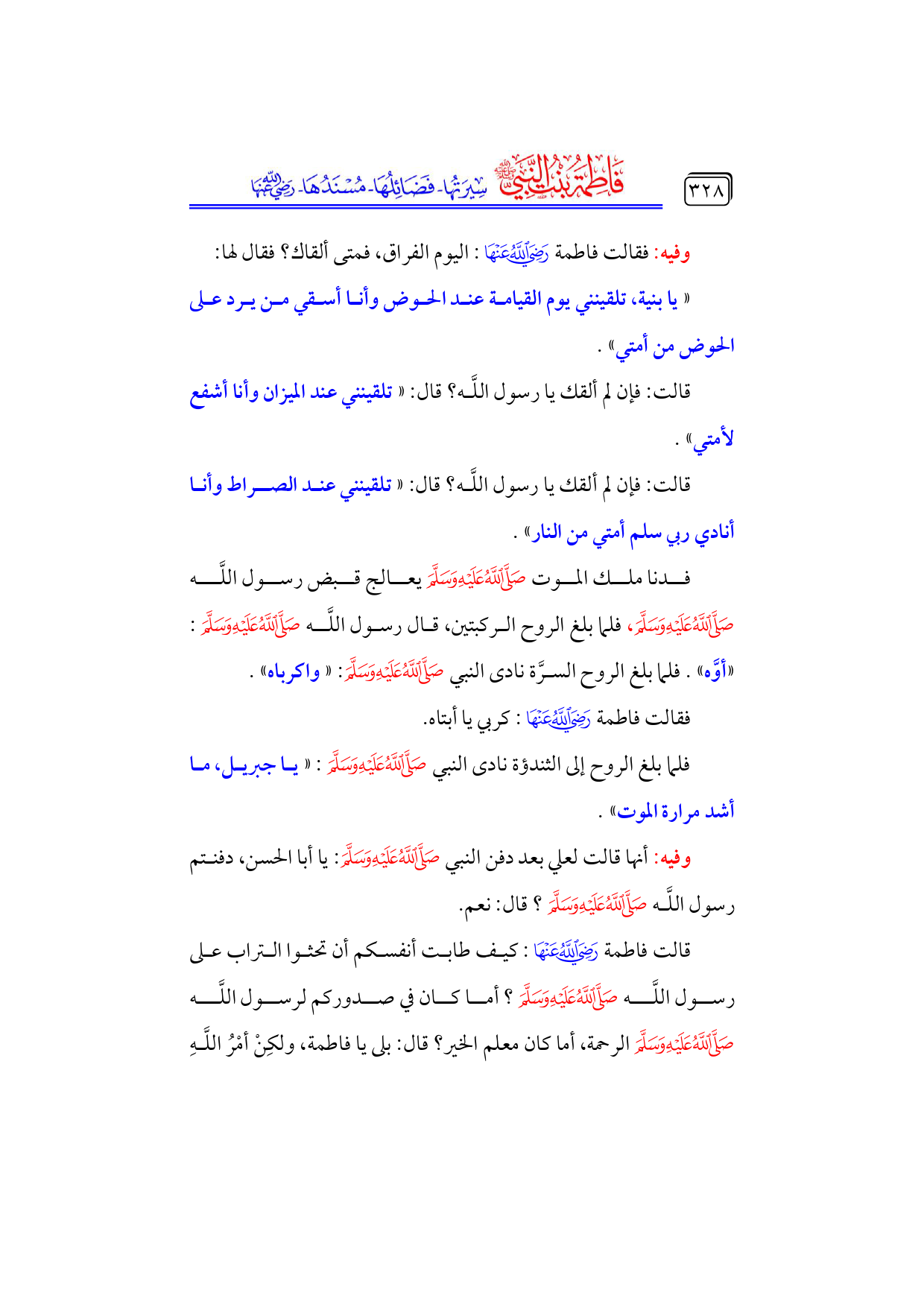 وفيه: فقالت فاطمة - رضي الله عنها -: اليوم الفراق، فمتى ألقاك؟ فقال لها: