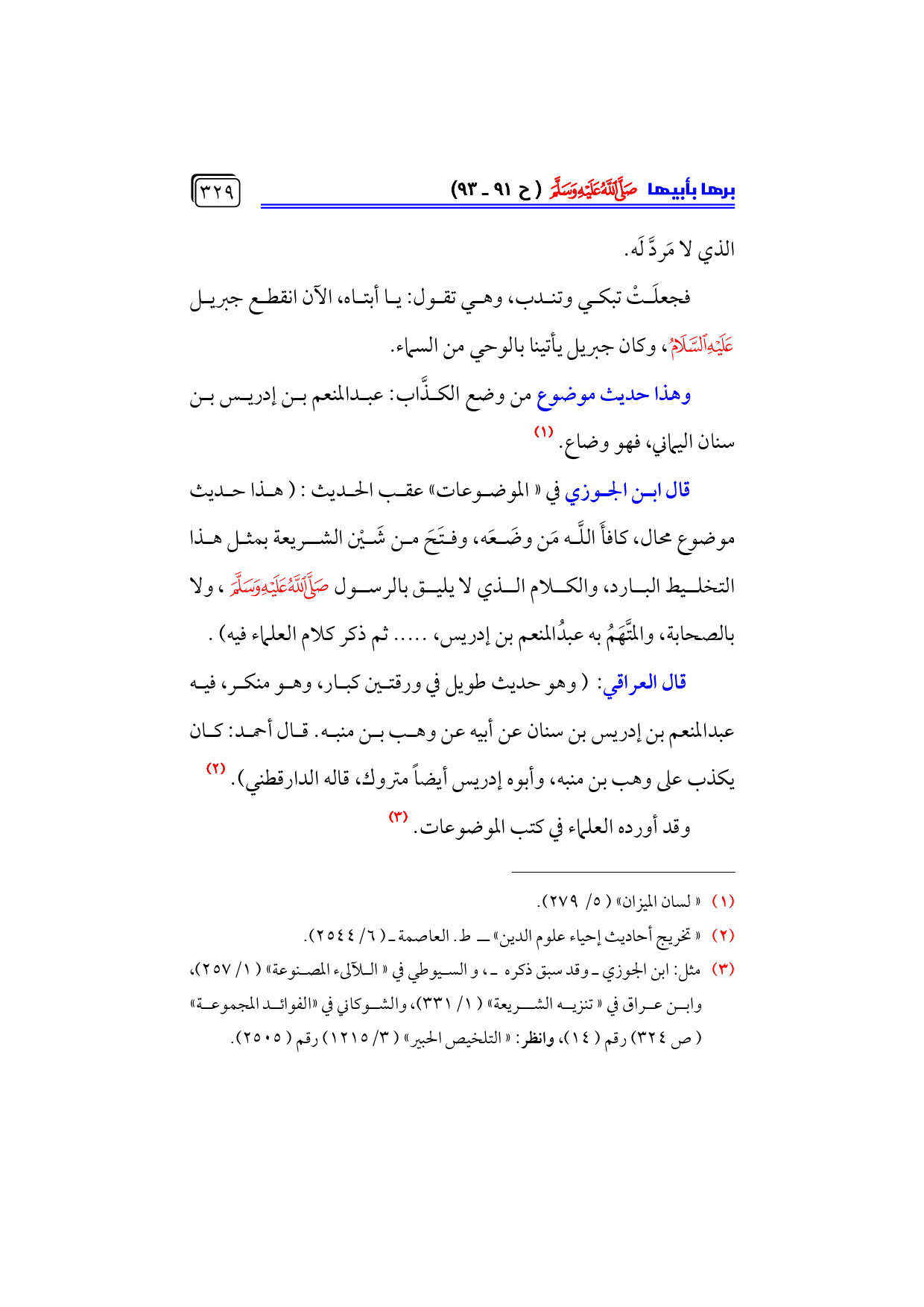 قال العراقي: (وهو حديث طويل في ورقتين كبار، وهو منكر، فيه ... عبدالمنعم بن إدريس بن سنان عن أبيه عن وهب بن منبه. قال أحمد: كان يكذب على وهب بن منبه، وأبوه إدريس أيضاً متروك، قاله الدارقطني). (¬٢)
