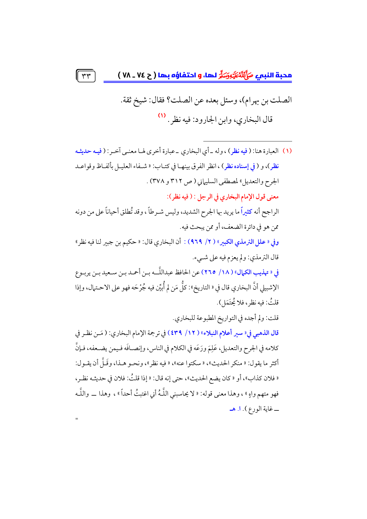 (¬١) العبارة هنا: (فيه نظر)، وله ـ أي البخاري ـ عبارة أخرى لها معنى آخر: (فيه حديثه نظر)، و (في إسناده نظر)، انظر الفرق بينها في كتاب: «شفاء العليل بألفاظ وقواعد الجرح والتعديل» لمصطفى السليماني (ص ٣١٢ و ٣٧٨).