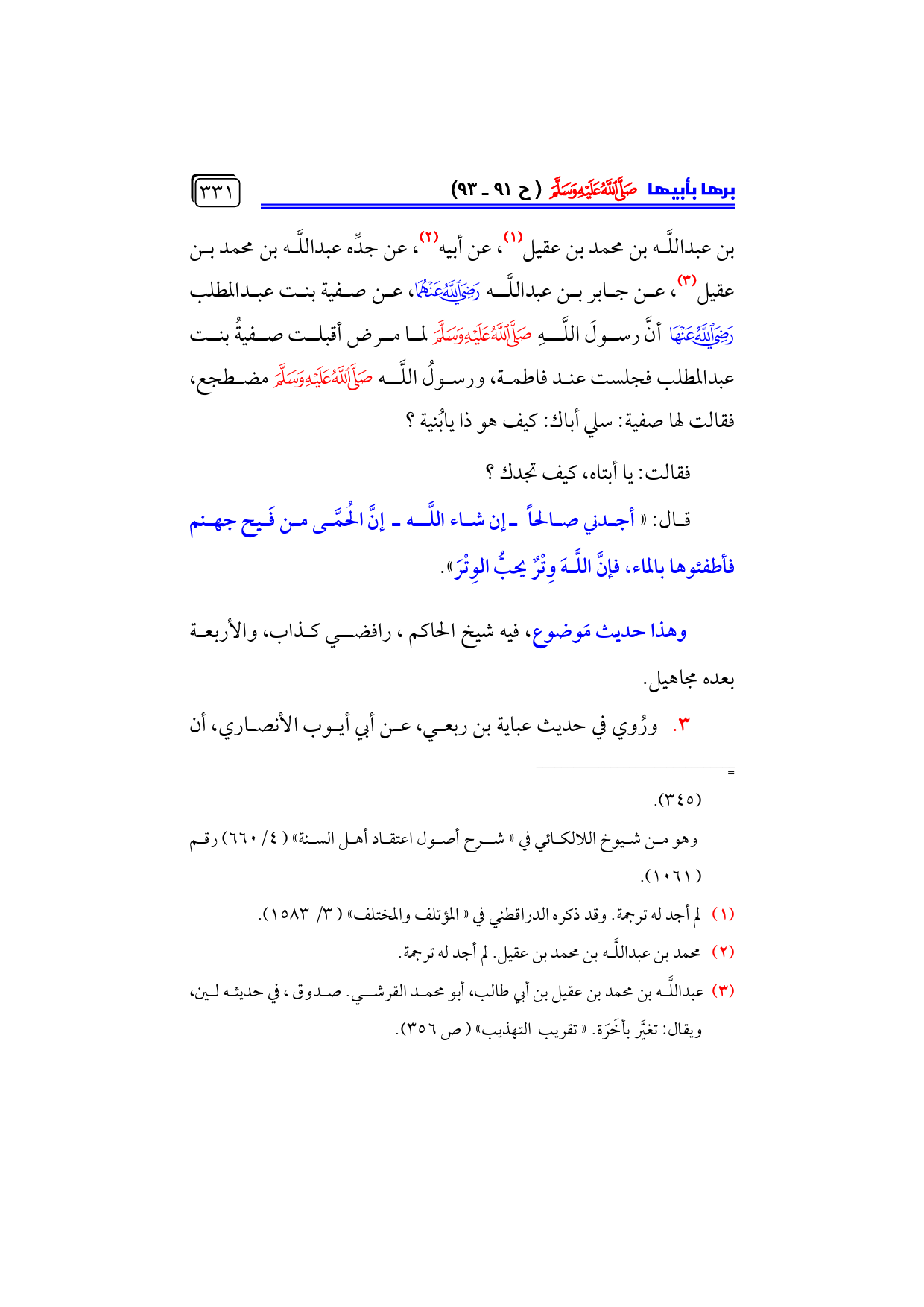 بن عبداللَّه بن محمد بن عقيل (¬١)، عن أبيه (¬٢)، عن جدِّه عبداللَّه بن محمد بن عقيل (¬٣)، عن جابر بن عبداللَّه - رضي الله عنهما -، عن صفية بنت عبدالمطلب - رضي الله عنها - أنَّ رسولَ اللَّهِ - صلى الله عليه وسلم - لما مرض أقبلت صفيةُ بنت عبدالمطلب فجلست عند فاطمة، ورسولُ اللَّه - صلى الله عليه وسلم - مضطجع، فقالت لها صفية: سلي أباك: كيف هو ذا يابُنية؟