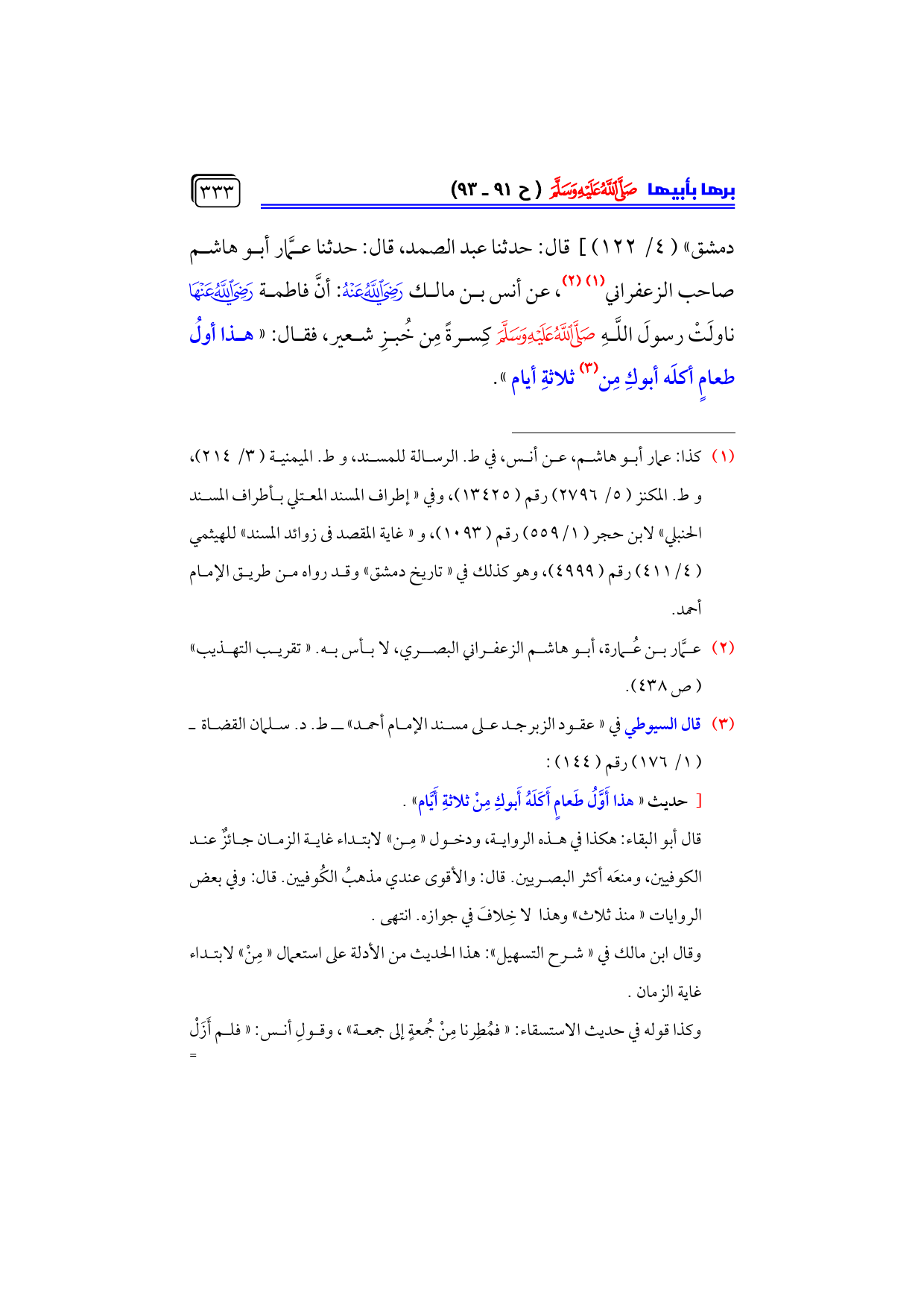 دمشق» (٤/ ١٢٢)] قال: حدثنا عبد الصمد، قال: حدثنا عمَّار أبو هاشم صاحب الزعفراني (¬١) (¬٢)، عن أنس بن مالك - رضي الله عنه -: أنَّ فاطمة - رضي الله عنها - ناولَتْ رسولَ اللَّهِ - صلى الله عليه وسلم - كِسرةً مِن خُبزِ شعير، فقال: «هذا أولُ طعامٍ أكلَه أبوكِ مِن (¬٣)