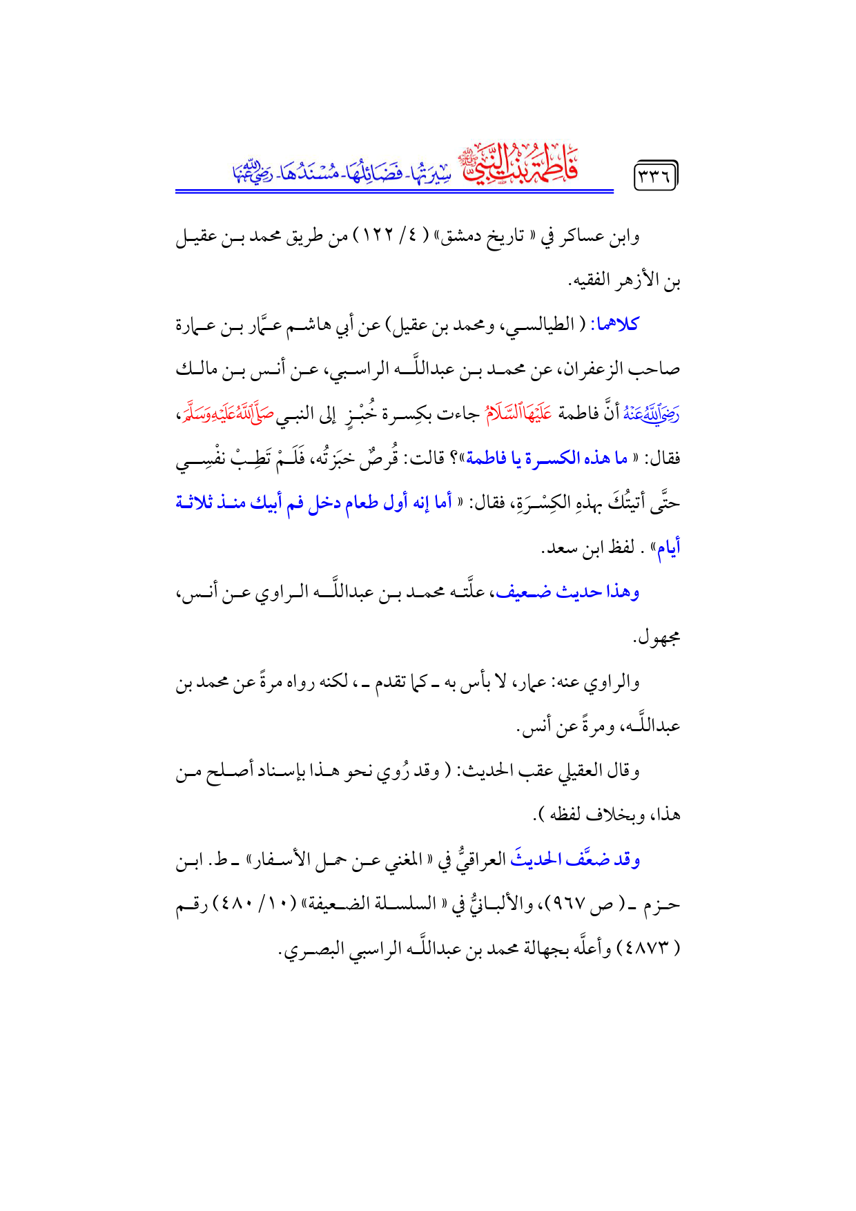 كلاهما: (الطيالسي، ومحمد بن عقيل) عن أبي هاشم عمَّار بن عمارة صاحب الزعفران، عن محمد بن عبداللَّه الراسبي، عن أنس بن مالك - رضي الله عنه - أنَّ فاطمة - عليها السلام - جاءت بكِسرة خُبْزٍ إلى النبي - صلى الله عليه وسلم -، فقال: «ما هذه الكسرة يا فاطمة»؟ قالت: قُرصٌ خبَزتُه، فَلَمْ تَطِبْ نفْسِي حتَّى أتيتُكَ بهذهِ الكِسْرَةِ، فقال: «أما إنه أول طعام دخل فم أبيك منذ ثلاثة أيام». لفظ ابن سعد.