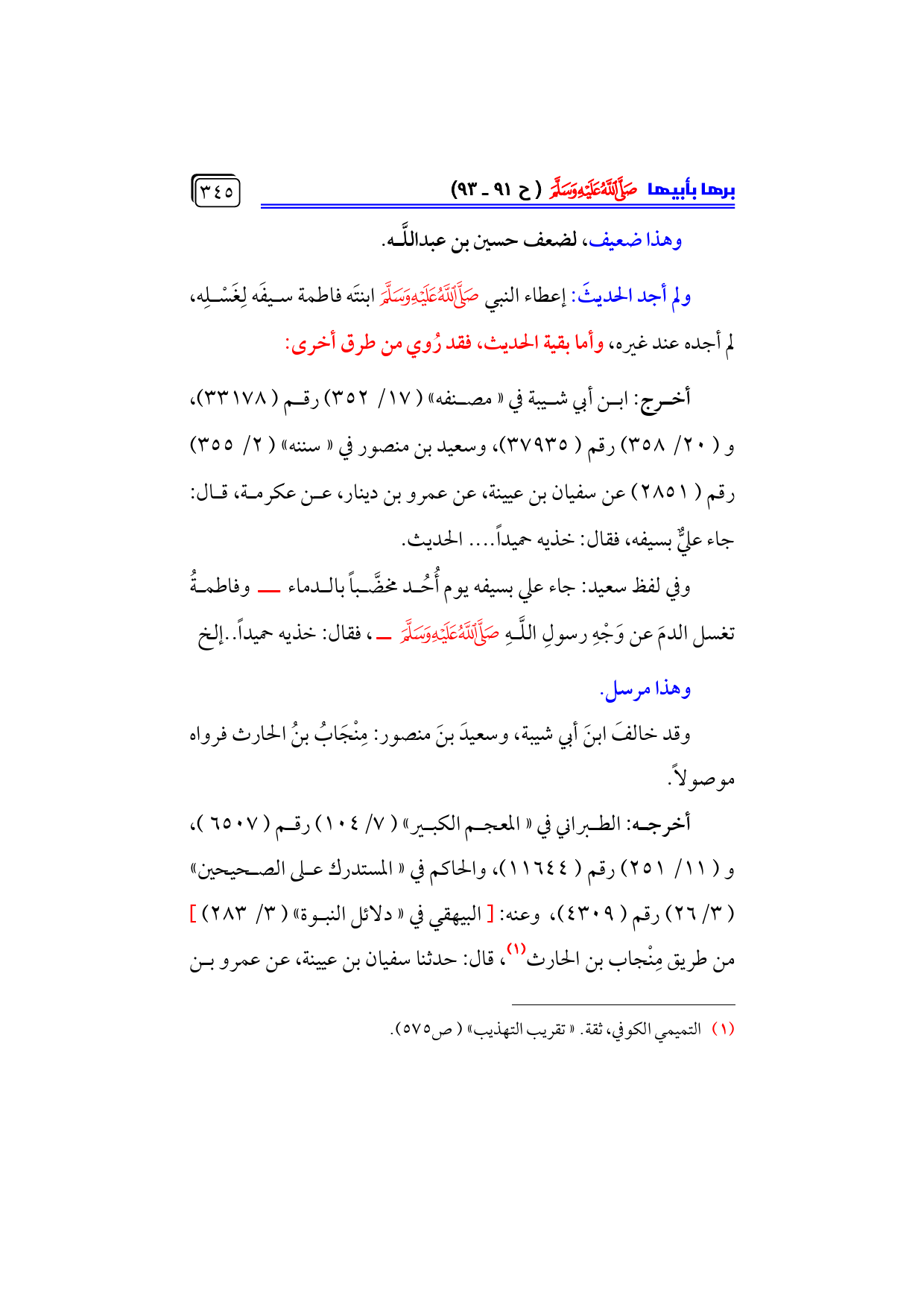 ولم أجد الحديثَ: إعطاء النبي - صلى الله عليه وسلم - ابنتَه فاطمة سيفَه لِغَسْلِه، لم أجده عند غيره، وأما بقية الحديث، فقد رُوي من طرق أخرى: