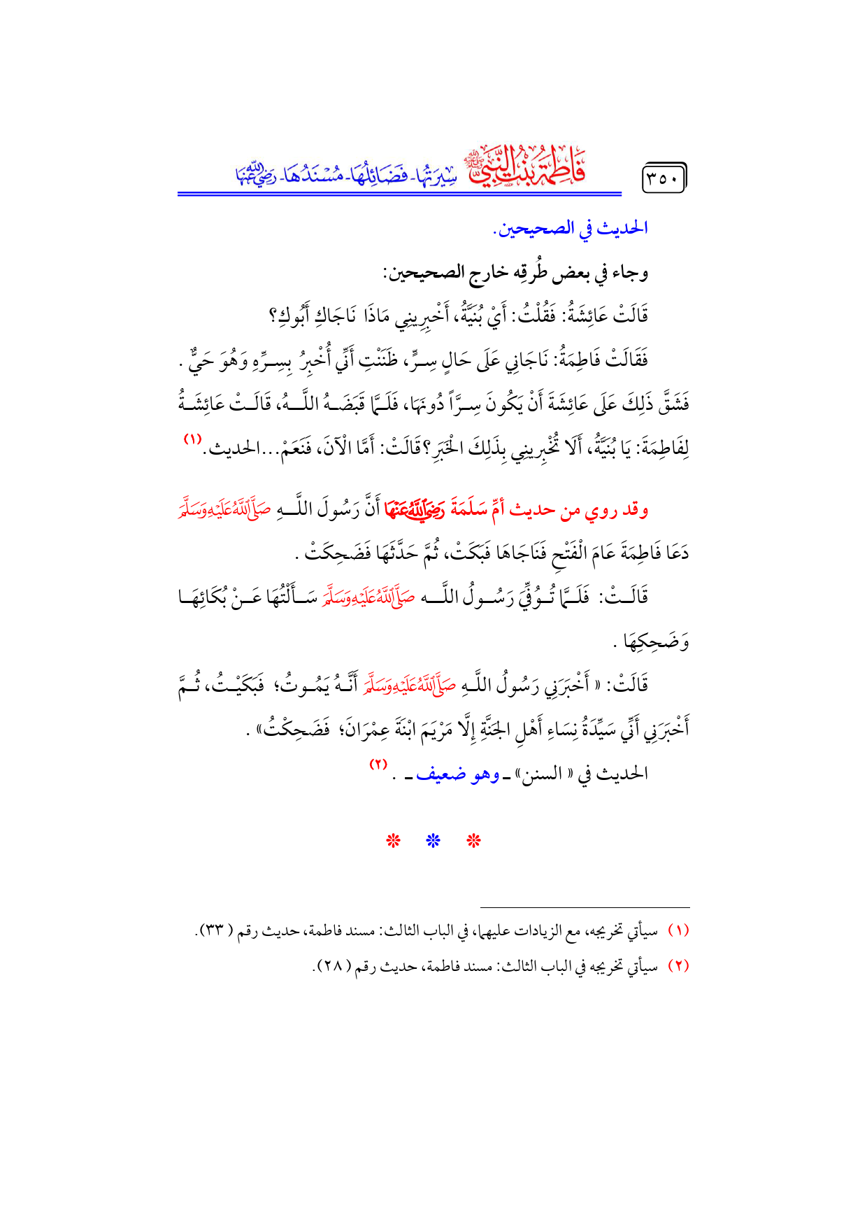 وقد روي من حديث أمِّ سَلَمَةَ - رضي الله عنها - أَنَّ رَسُولَ اللَّهِ - صلى الله عليه وسلم - دَعَا فَاطِمَةَ عَامَ الْفَتْحِ فَنَاجَاهَا فَبَكَتْ، ثُمَّ حَدَّثَهَا فَضَحِكَتْ.