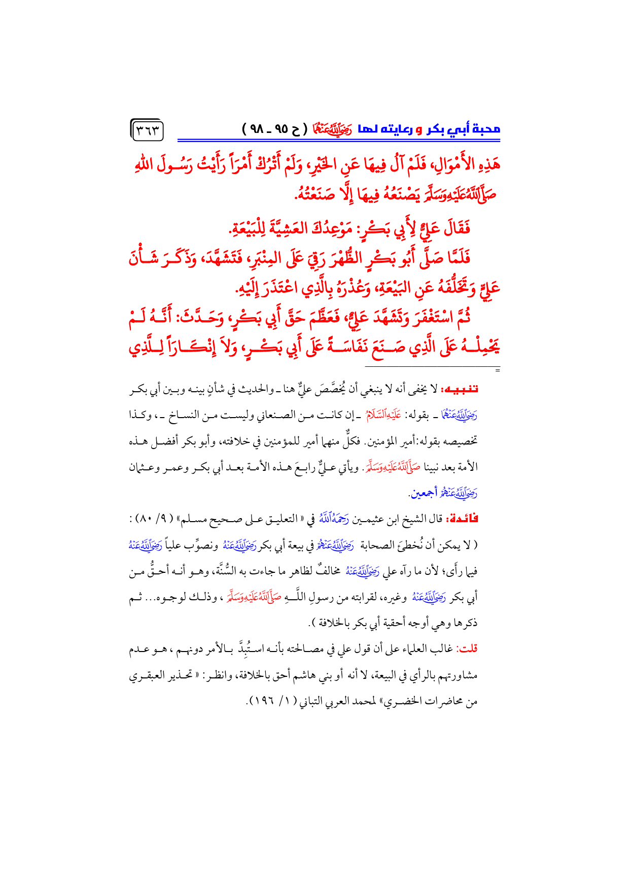 ثُمَّ اسْتَغْفَرَ وَتَشَهَّدَ عَلِيٌّ، فَعَظَّمَ حَقَّ أَبِي بَكْرٍ، وَحَدَّثَ: أَنَّهُ لَمْ يَحْمِلْهُ عَلَى الَّذِي صَنَعَ نَفَاسَةً عَلَى أَبِي بَكْرٍ، وَلا إِنْكَارَاً لِلَّذِي ...