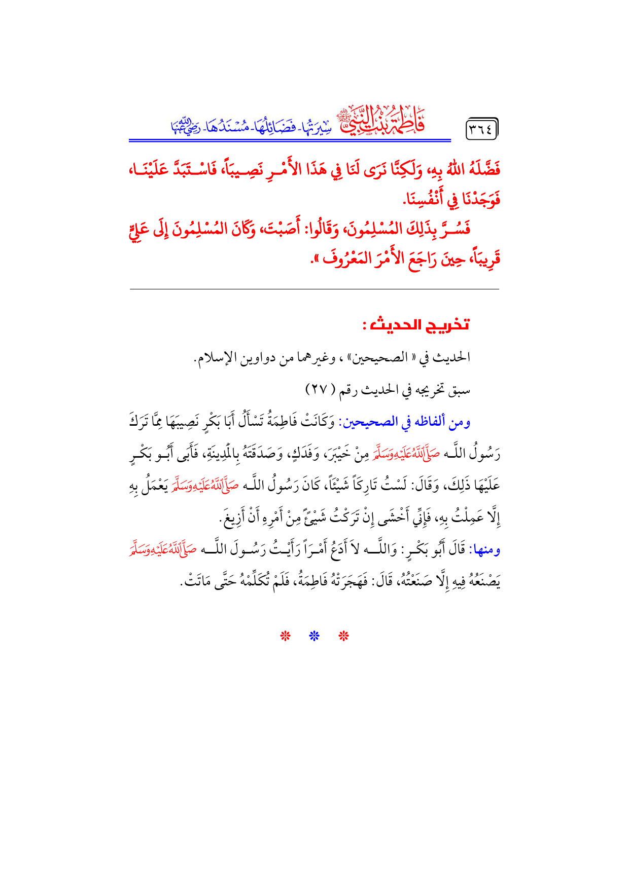 ومنها: قَالَ أَبُو بَكْرٍ: وَاللَّه لا أَدَعُ أَمْرَاً رَأَيْتُ رَسُولَ اللَّه - صلى الله عليه وسلم - يَصْنَعُهُ فِيهِ إِلَّا صَنَعْتُهُ، قَالَ: فَهَجَرَتْهُ فَاطِمَةُ، فَلَمْ تُكَلِّمْهُ حَتَّى مَاتَتْ.