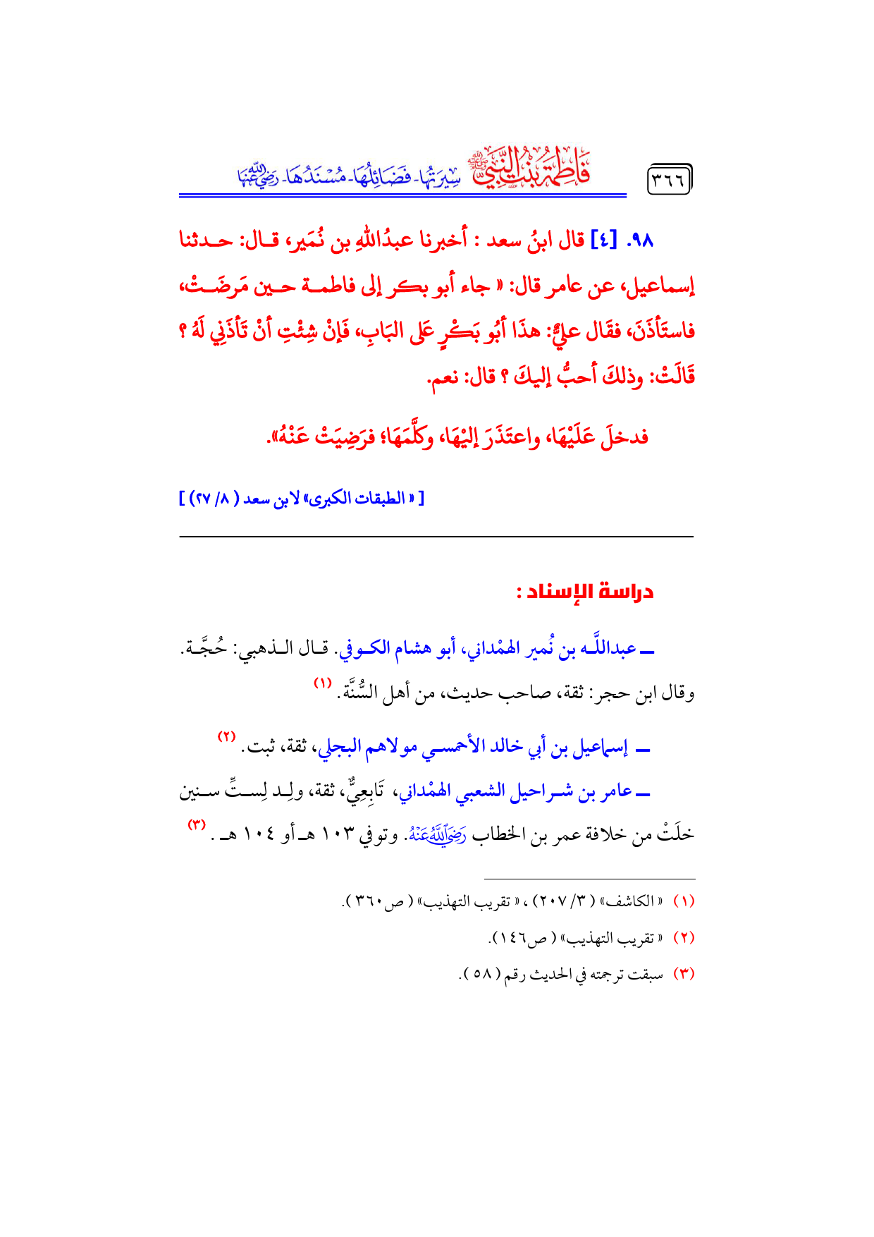٩٧. [٤] قال ابنُ سعد: أخبرنا عبدُاللهِ بن نُمَير، قال: حدثنا إسماعيل، عن عامر قال: «جاء أبو بكر إلى فاطمة حين مَرضَتْ، فاستَأذَنَ، فقَال عليٌّ: هذَا أبُو بَكْرٍ عَلى البَابِ، فَإنْ شِئْتِ أنْ تَأذَنِي لَهُ؟ قَالَتْ: وذلكَ أحبُّ إليكَ؟ قال: نعم.