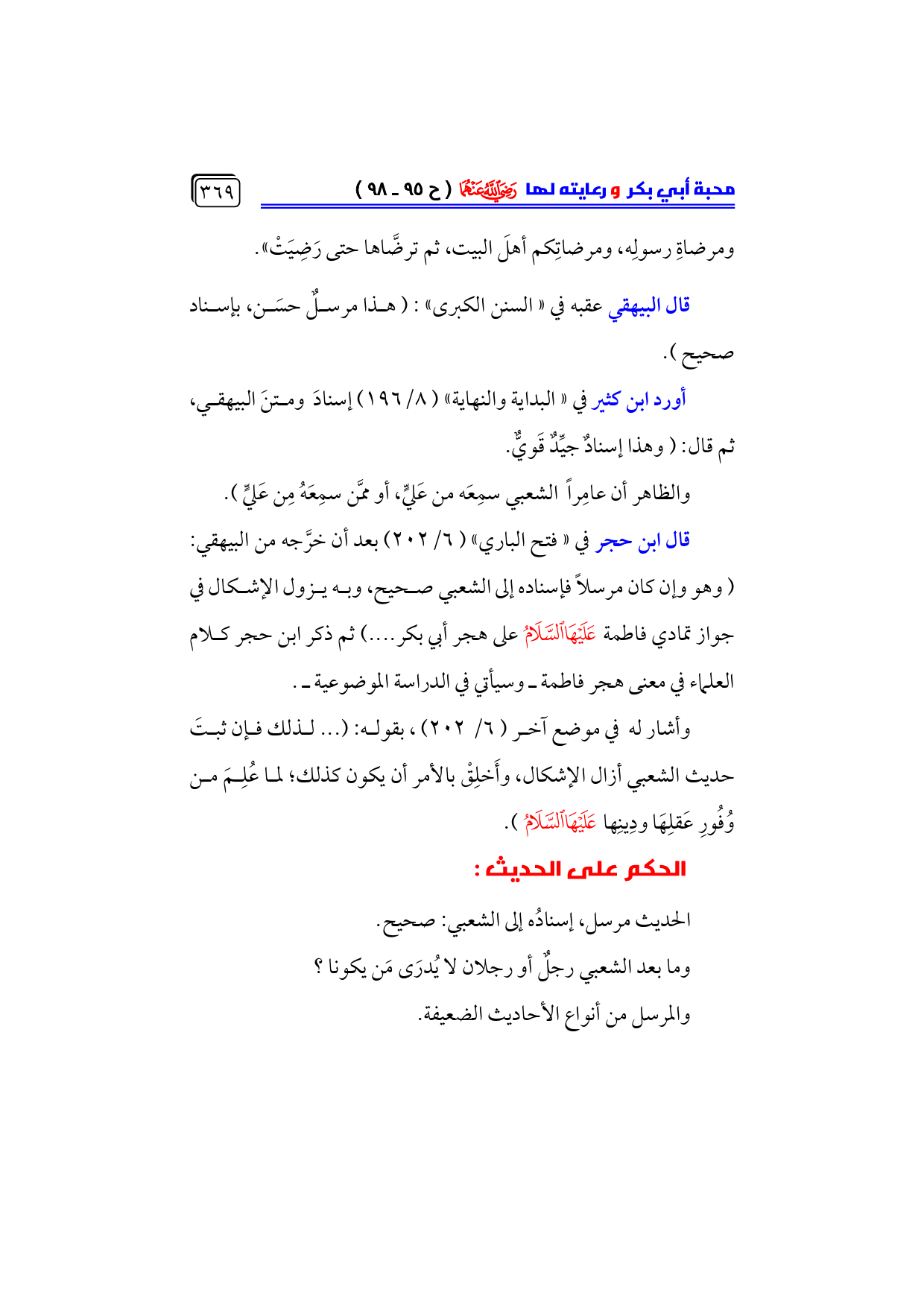 قال ابن حجر في «فتح الباري» (٦/ ٢٠٢) بعد أن خرَّجه من البيهقي: (وهو وإن كان مرسلاً فإسناده إلى الشعبي صحيح، وبه يزول الإشكال في جواز تمادي فاطمة - عليها السلام - على هجر أبي بكر .... ) ثم ذكر ابن حجر كلام العلماء في معنى هجر فاطمة ـ وسيأتي في الدراسة الموضوعية ـ.