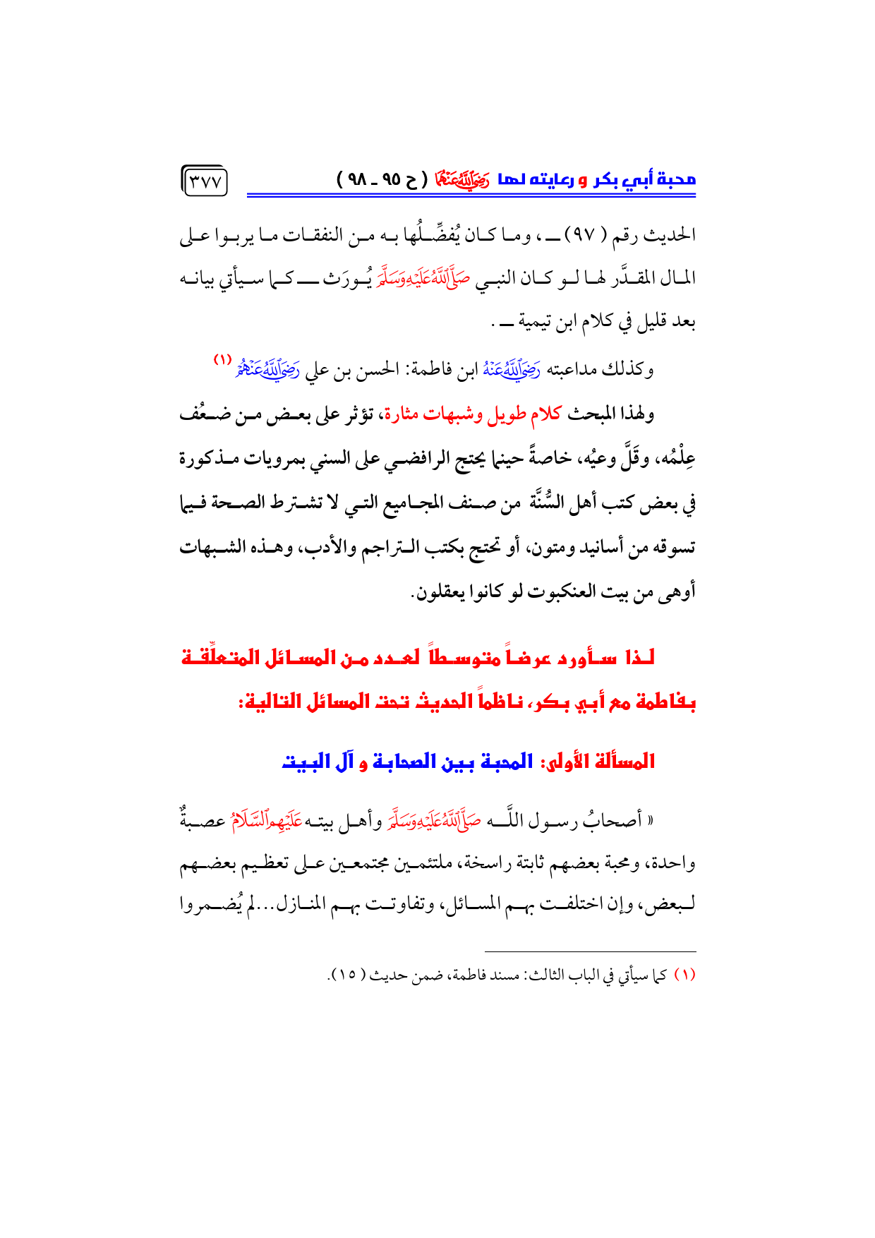(¬١) كما سيأتي في الباب الثالث: مسند فاطمة، ضمن حديث (١٥).