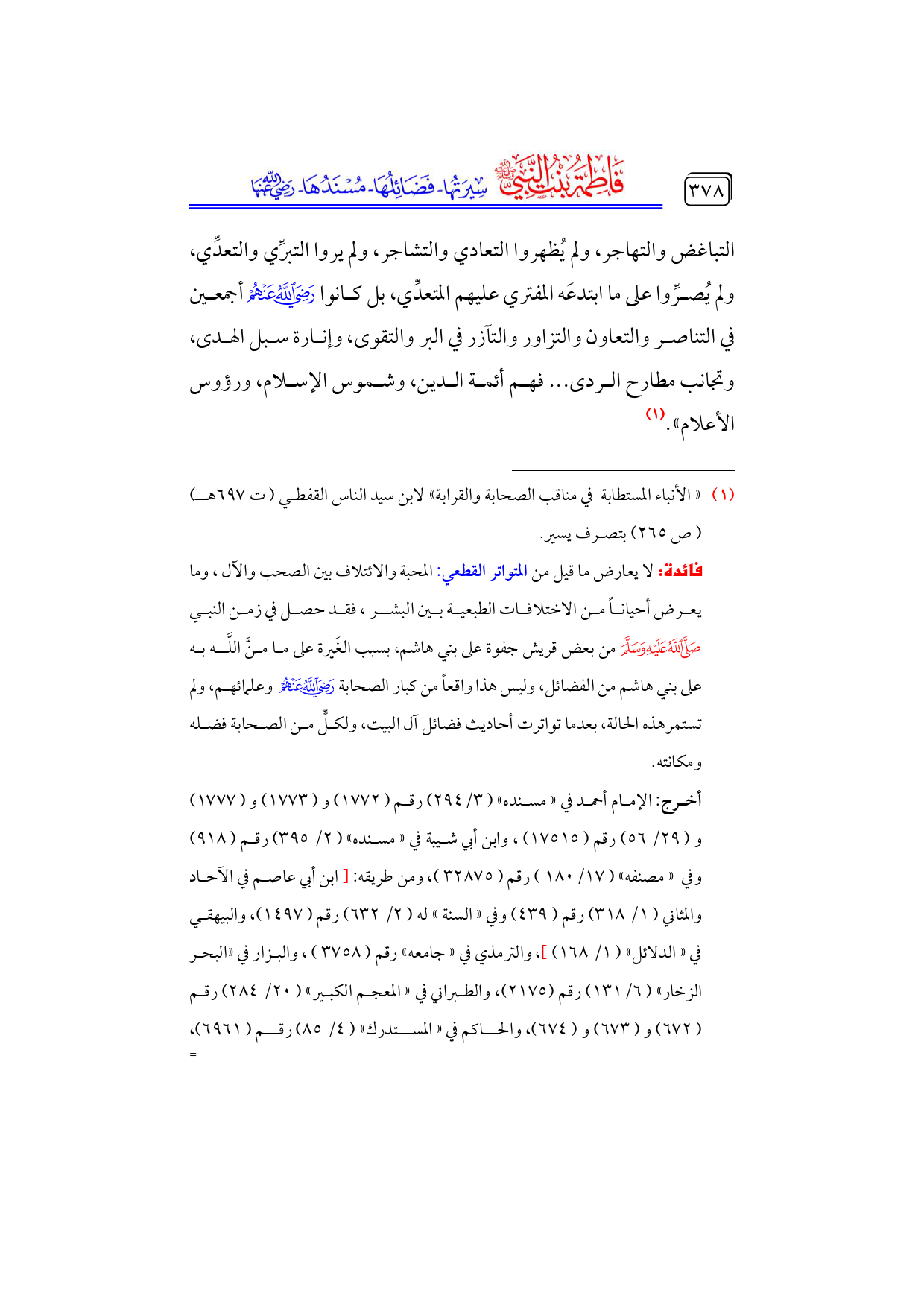 فائدة: لا يعارض ما قيل من المتواتر القطعي: المحبة والائتلاف بين الصحب والآل، وما يعرض أحياناً من الاختلافات الطبعية بين البشر، فقد حصل في زمن النبي - صلى الله عليه وسلم - من بعض قريش جفوة على بني هاشم، بسبب الغَيرة على ما منَّ اللَّه به على بني هاشم من الفضائل، وليس هذا واقعاً من كبار الصحابة - رضي الله عنهم - وعلمائهم، ولم تستمرهذه الحالة، بعدما تواترت أحاديث فضائل آل البيت، ولكلٍّ من الصحابة فضله ومكانته.