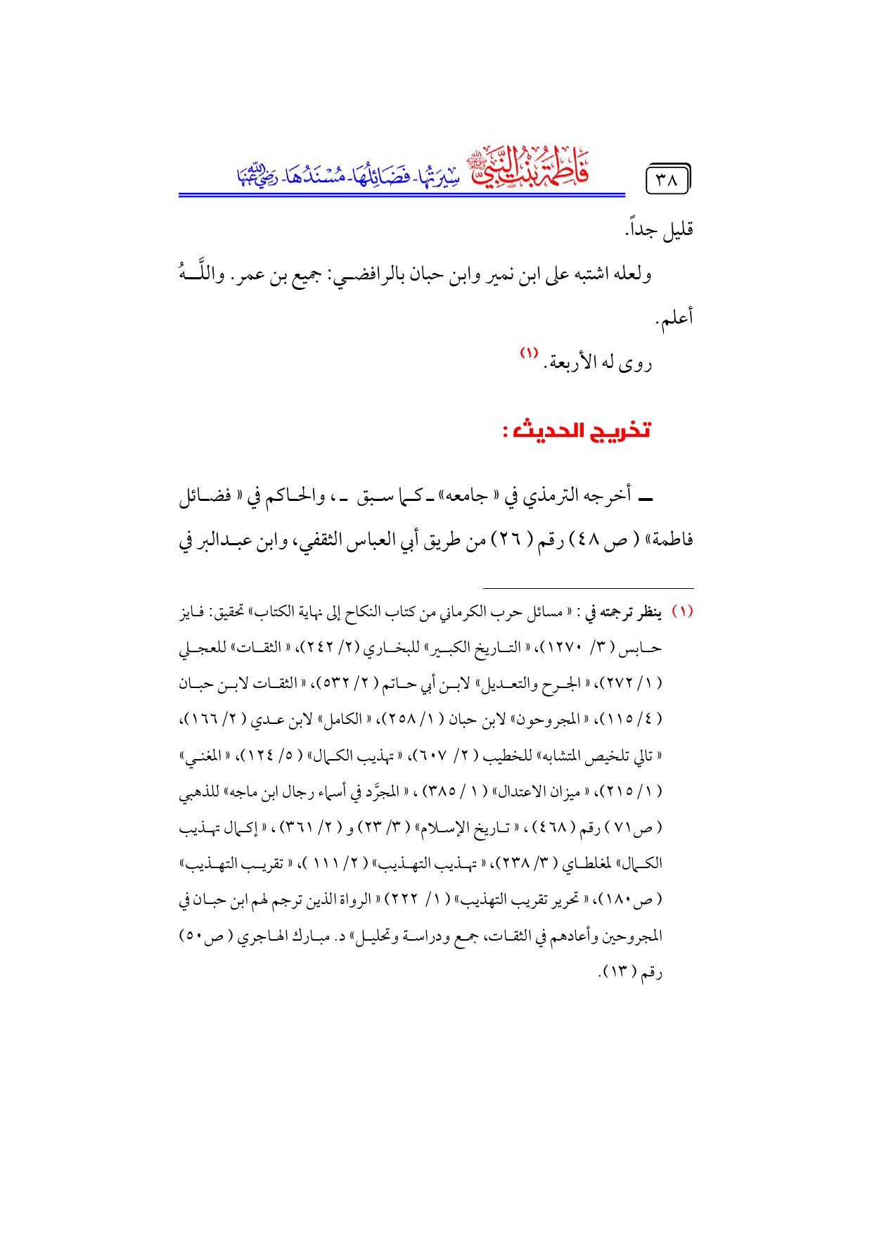ــ أخرجه الترمذي في «جامعه» ـ كما سبق ـ، والحاكم في «فضائل فاطمة» (ص ٤٨) رقم (٢٦) من طريق أبي العباس الثقفي، وابن عبدالبر في
