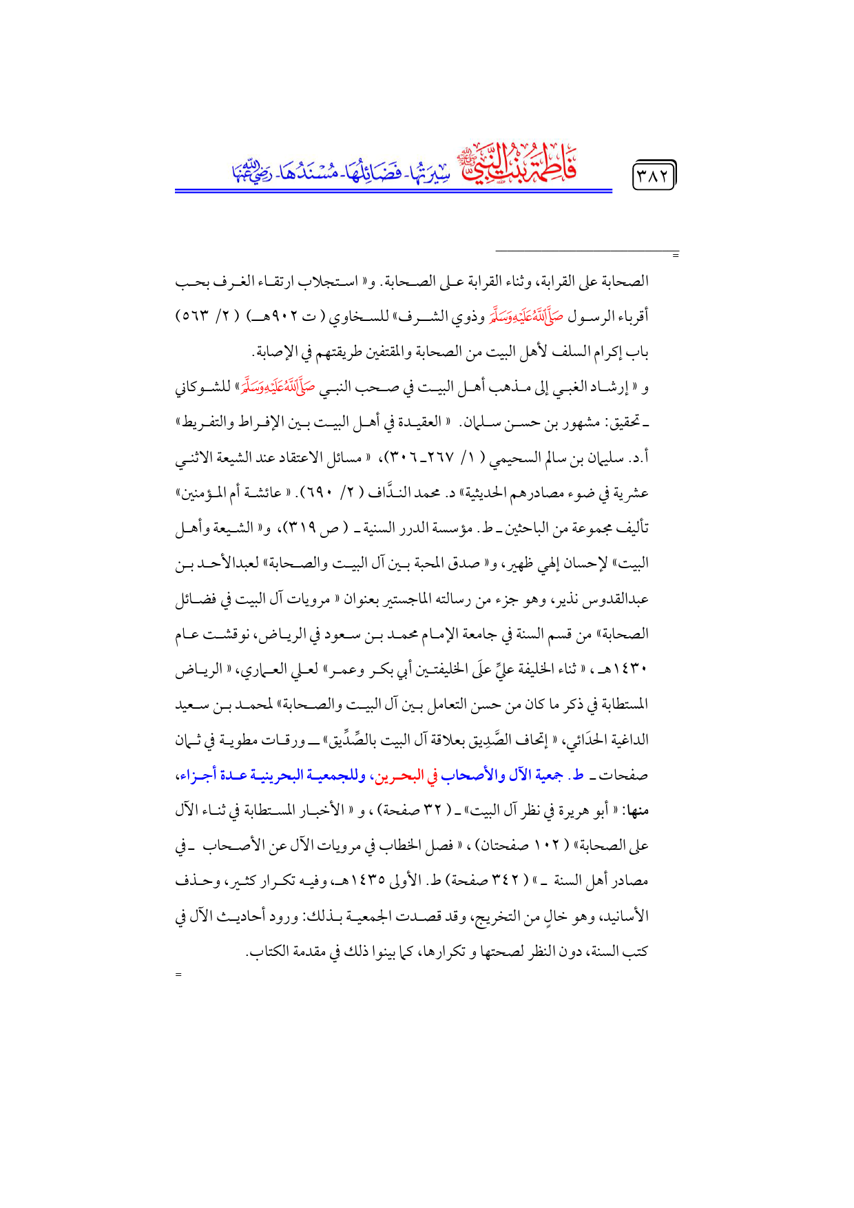 و «إرشاد الغبي إلى مذهب أهل البيت في صحب النبي - صلى الله عليه وسلم -» للشوكاني ... ـ تحقيق: مشهور بن حسن سلمان. «العقيدة في أهل البيت بين الإفراط والتفريط» ... أ. د. سليمان بن سالم السحيمي (١/ ٢٦٧ ـ ٣٠٦)، «مسائل الاعتقاد عند الشيعة الاثني عشرية في ضوء مصادرهم الحديثية» د. محمد الندَّاف (٢/ ٦٩٠). «عائشة أم المؤمنين» تأليف مجموعة من الباحثين ـ ط. مؤسسة الدرر السنية ـ (ص ٣١٩)، و «الشيعة وأهل البيت» لإحسان إلهي ظهير، و «صدق المحبة بين آل البيت والصحابة» لعبدالأحد بن عبدالقدوس نذير، وهو جزء من رسالته الماجستير بعنوان «مرويات آل البيت في فضائل الصحابة» من قسم السنة في جامعة الإمام محمد بن سعود في الرياض، نوقشت عام ١٤٣٠ هـ، «ثناء الخليفة عليِّ علَى الخليفتين أبي بكر وعمر» لعلي العماري، «الرياض المستطابة في ذكر ما كان من حسن التعامل بين آل البيت والصحابة» لمحمد بن سعيد الداغية الحدَائي، «إتحاف الصَّدِيق بعلاقة آل البيت بالصِّدِّيق» ـ ورقات مطوية في ثمان صفحات ـ ط. جمعية الآل والأصحاب في البحرين، وللجمعية البحرينية عدة أجزاء، منها: «أبو هريرة في نظر آل البيت» ـ (٣٢ صفحة)، و «الأخبار المستطابة في ثناء الآل على الصحابة» (١٠٢ صفحتان)، «فصل الخطاب في مرويات الآل عن الأصحاب ـ في مصادر أهل السنة ـ» (٣٤٢ صفحة) ط. الأولى ١٤٣٥ هـ، وفيه تكرار كثير، وحذف الأسانيد، وهو خالٍ من التخريج، وقد قصدت الجمعية بذلك: ورود أحاديث الآل في كتب السنة، دون النظر لصحتها وتكرارها، كما بينوا ذلك في مقدمة الكتاب. =