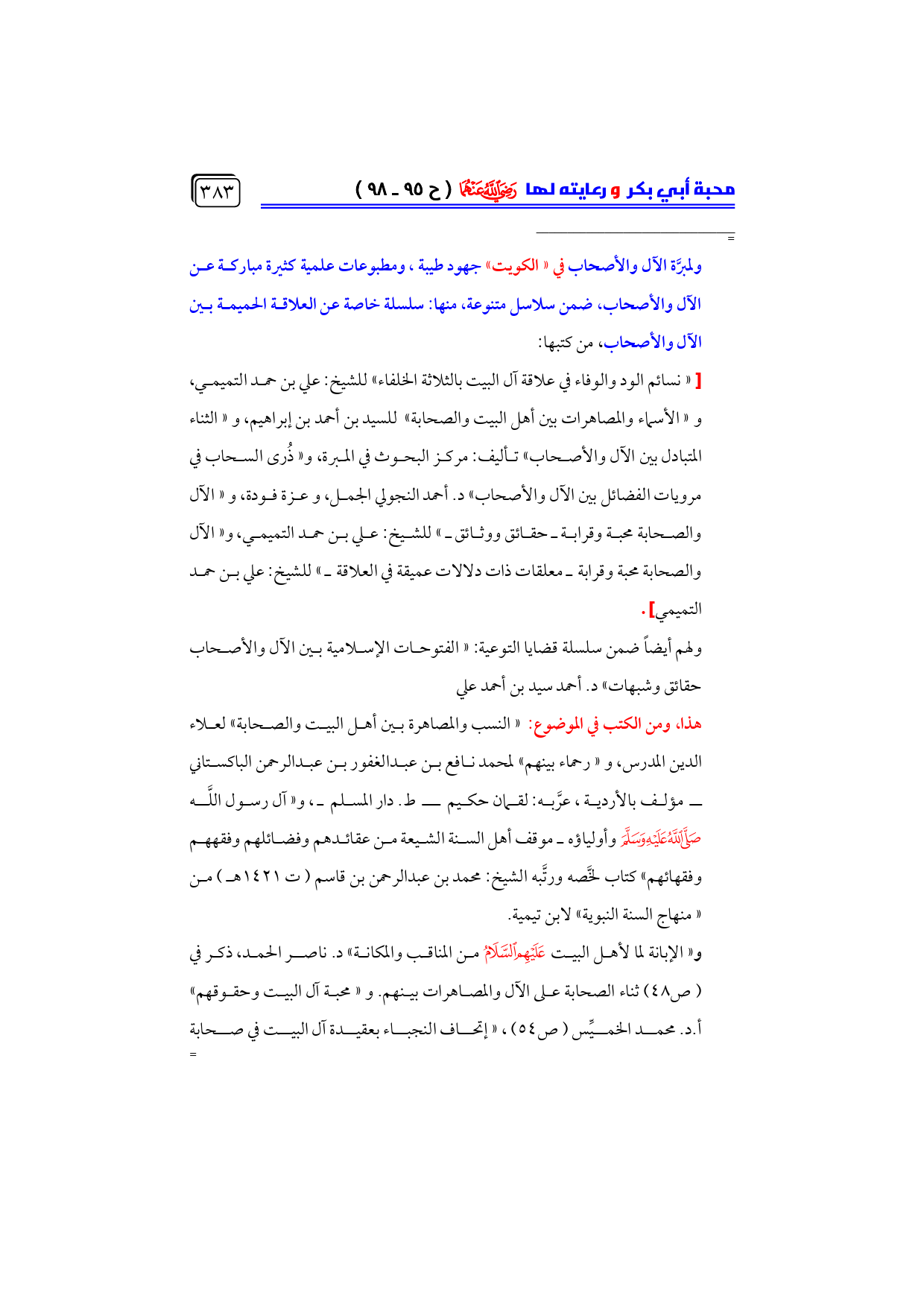 و «الإبانة لما لأهل البيت - عليهم السلام - من المناقب والمكانة» د. ناصر الحمد، ذكر في ... (ص ٤٨) ثناء الصحابة على الآل والمصاهرات بينهم. و «محبة آل البيت وحقوقهم» ... أ. د. محمد الخميِّس (ص ٥٤)، «إتحاف النجباء بعقيدة آل البيت في صحابة =
