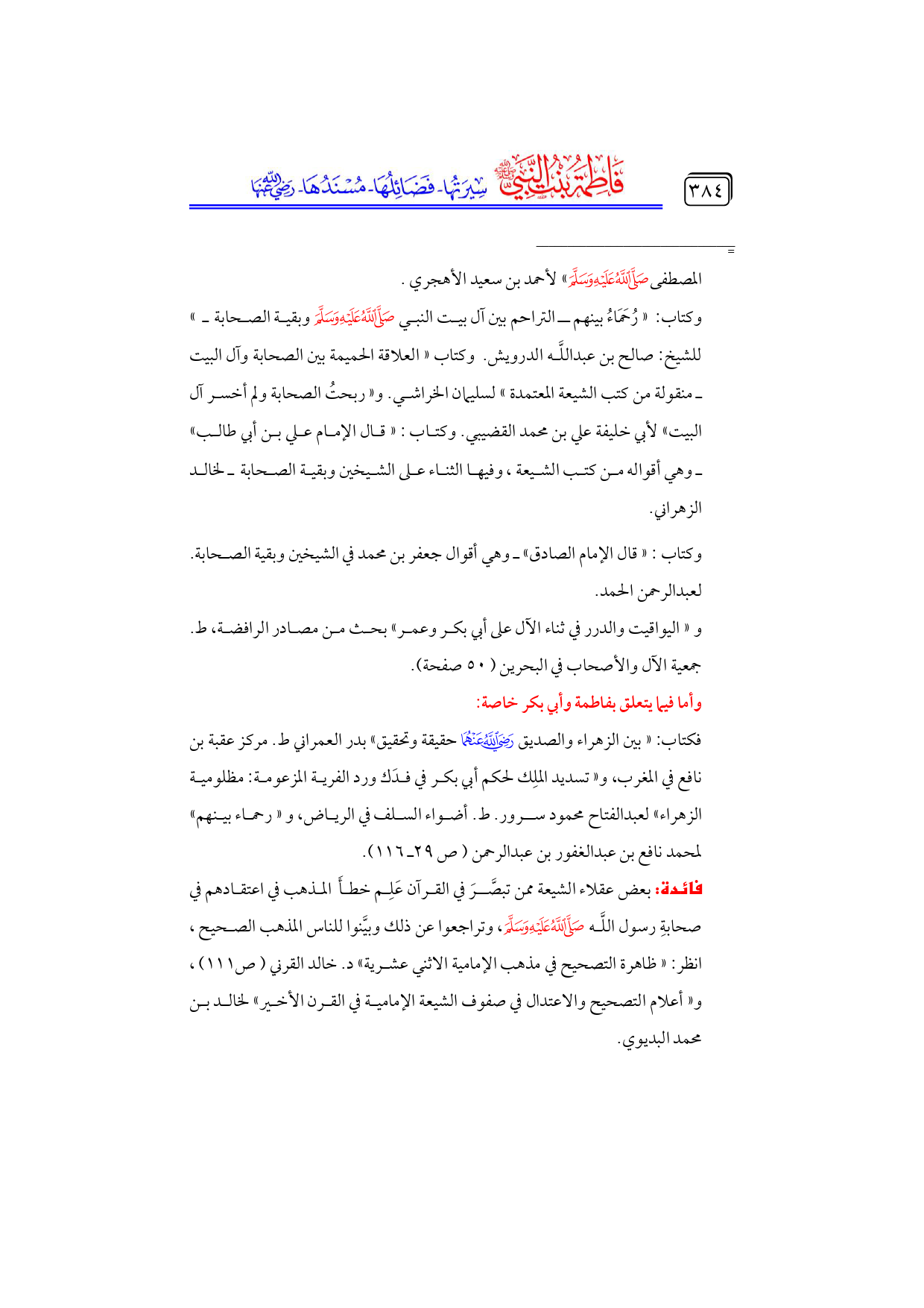 فكتاب: «بين الزهراء والصديق - رضي الله عنهما - حقيقة وتحقيق» بدر العمراني ط. مركز عقبة بن نافع في المغرب، و «تسديد الملِك لحكم أبي بكر في فدَك ورد الفرية المزعومة: مظلومية الزهراء» لعبدالفتاح محمود سرور. ط. أضواء السلف في الرياض، و «رحماء بينهم» لمحمد نافع بن عبدالغفور بن عبدالرحمن (ص ٢٩ ـ ١١٦).