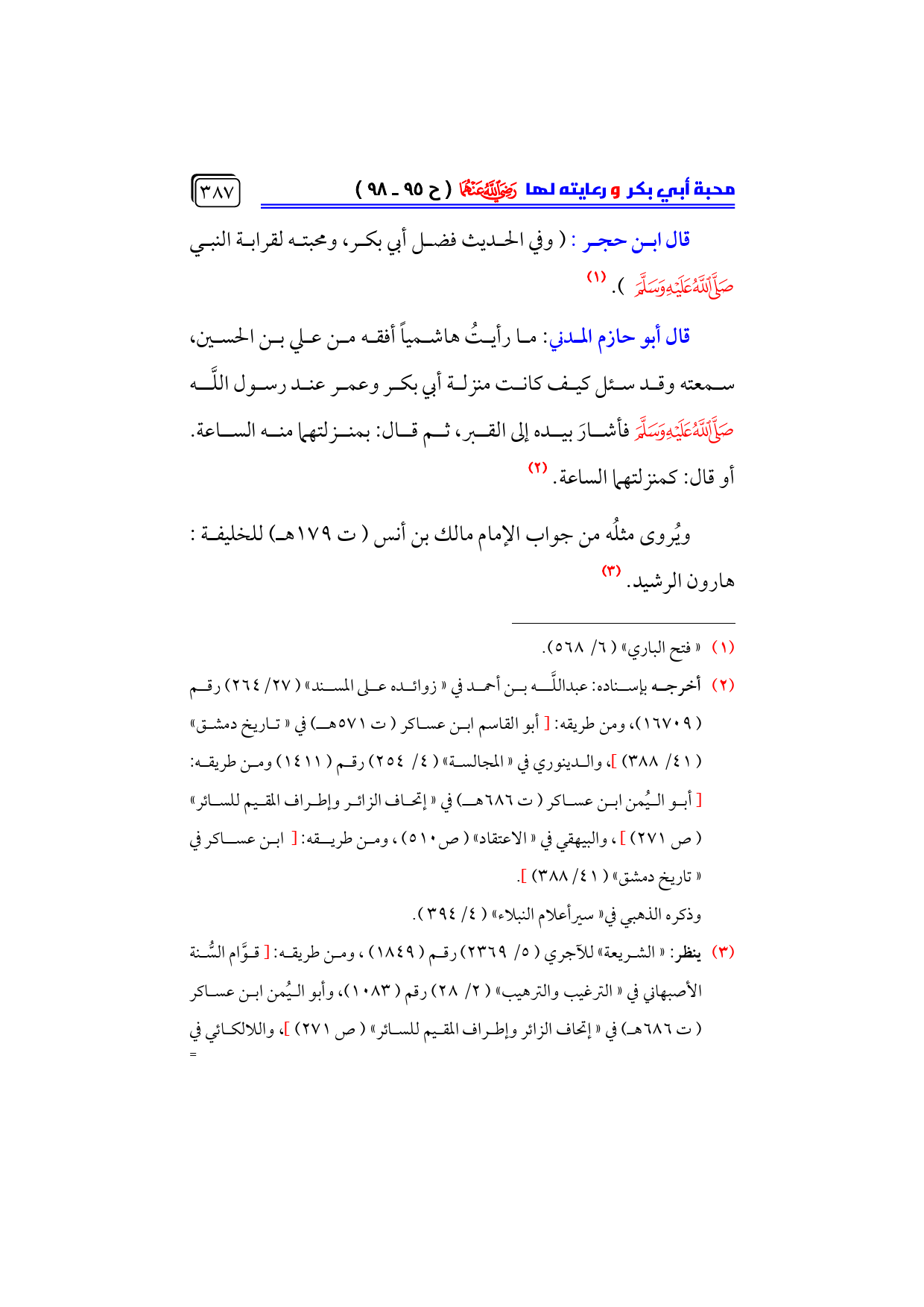 (¬٣) ينظر: «الشريعة» للآجري (٥/ ٢٣٦٩) رقم (١٨٤٩)، ومن طريقه: [قوَّام السُّنة الأصبهاني في «الترغيب والترهيب» (٢/ ٢٨) رقم (١٠٨٣)، وأبو اليُمن ابن عساكر ... (ت ٦٨٦ هـ) في «إتحاف الزائر وإطراف المقيم للسائر» (ص ٢٧١)]، واللالكائي في ... «شرح أصول إعتقاد أهل السنة» (٧/ ١٢٩٩) رقم (٢٤٦١)، والمبارك الطيوري كما في «الطيوريات» (١/ ٢١٦) رقم (١٤٨)، وابن عساكر في «تاريخ دمشق» ... (٣٠/ ٣٩٦).