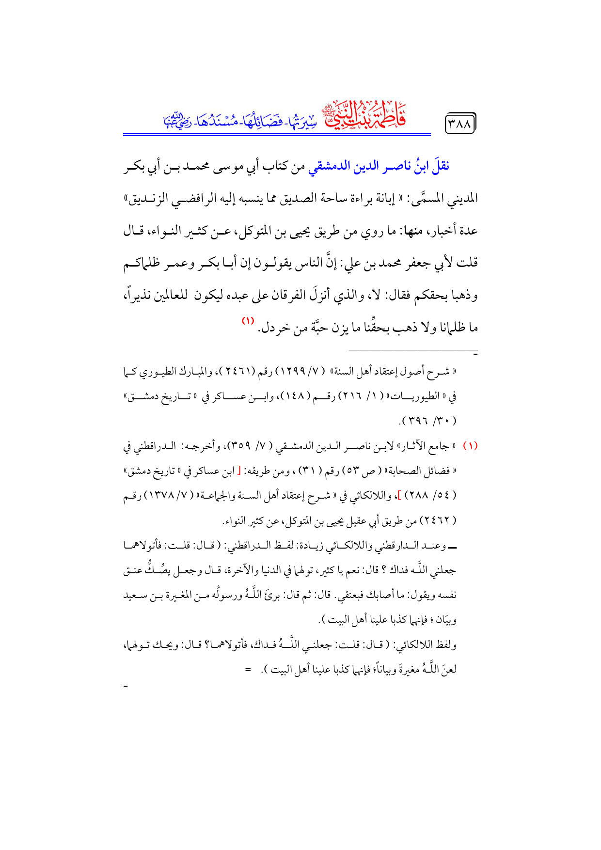 نقلَ ابنُ ناصر الدين الدمشقي من كتاب أبي موسى محمد بن أبي بكر المديني المسمَّى: «إبانة براءة ساحة الصديق مما ينسبه إليه الرافضي الزنديق» عدة أخبار، منها: ما روي من طريق يحيى بن المتوكل، عن كثير النواء، قال قلت لأبي جعفر محمد بن علي: إنَّ الناس يقولون إن أبا بكر وعمر ظلماكم وذهبا بحقكم فقال: لا، والذي أنزلَ الفرقان على عبده ليكون للعالمين نذيراً، ما ظلمانا ولا ذهب بحقِّنا ما يزن حبَّة من خردل. (¬١)