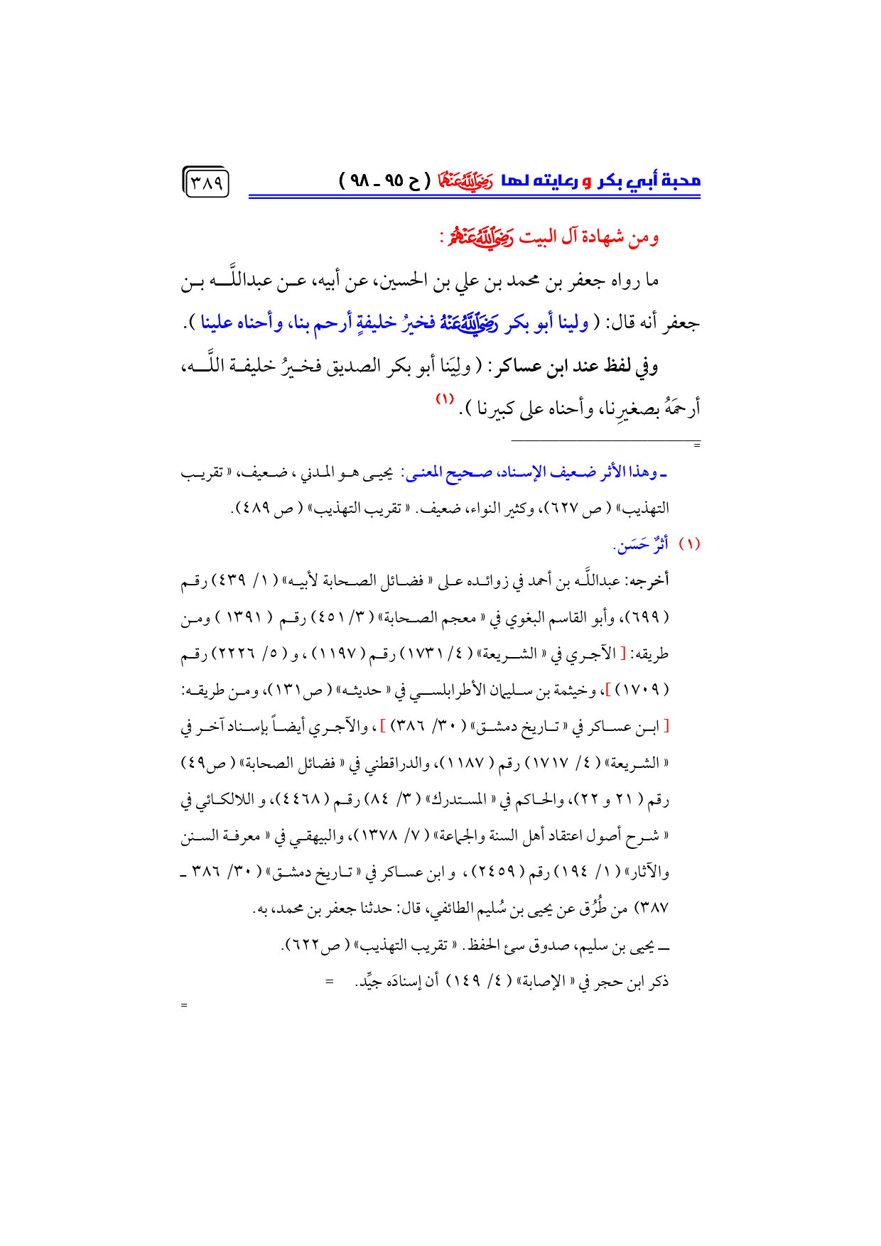 أخرجه: عبداللَّه بن أحمد في زوائده على «فضائل الصحابة لأبيه» (١/ ٤٣٩) رقم ... (٦٩٩)، وأبو القاسم البغوي في «معجم الصحابة» (٣/ ٤٥١) رقم (١٣٩١) ومن طريقه: [الآجري في «الشريعة» (٤/ ١٧٣١) رقم (١١٩٧)، و (٥/ ٢٢٢٦) رقم ... (١٧٠٩)]، وخيثمة بن سليمان الأطرابلسي في «حديثه» (ص ١٣١)، ومن طريقه: ... [ابن عساكر في «تاريخ دمشق» (٣٠/ ٣٨٦)]، والآجري أيضاً بإسناد آخر في ... «الشريعة» (٤/ ١٧١٧) رقم (١١٨٧)، والدراقطني في «فضائل الصحابة» (ص ٤٩) رقم (٢١ و ٢٢)، والحاكم في «المستدرك» (٣/ ٨٤) رقم (٤٤٦٨)، واللالكائي في ... «شرح أصول اعتقاد أهل السنة والجماعة» (٧/ ١٣٧٨)، والبيهقي في «معرفة السنن والآثار» (١/ ١٩٤) رقم (٢٤٥٩)، وابن عساكر في «تاريخ دمشق» (٣٠/ ٣٨٦ ـ ٣٨٧) من طُرُق عن يحيى بن سُليم الطائفي، قال: حدثنا جعفر بن محمد، به.