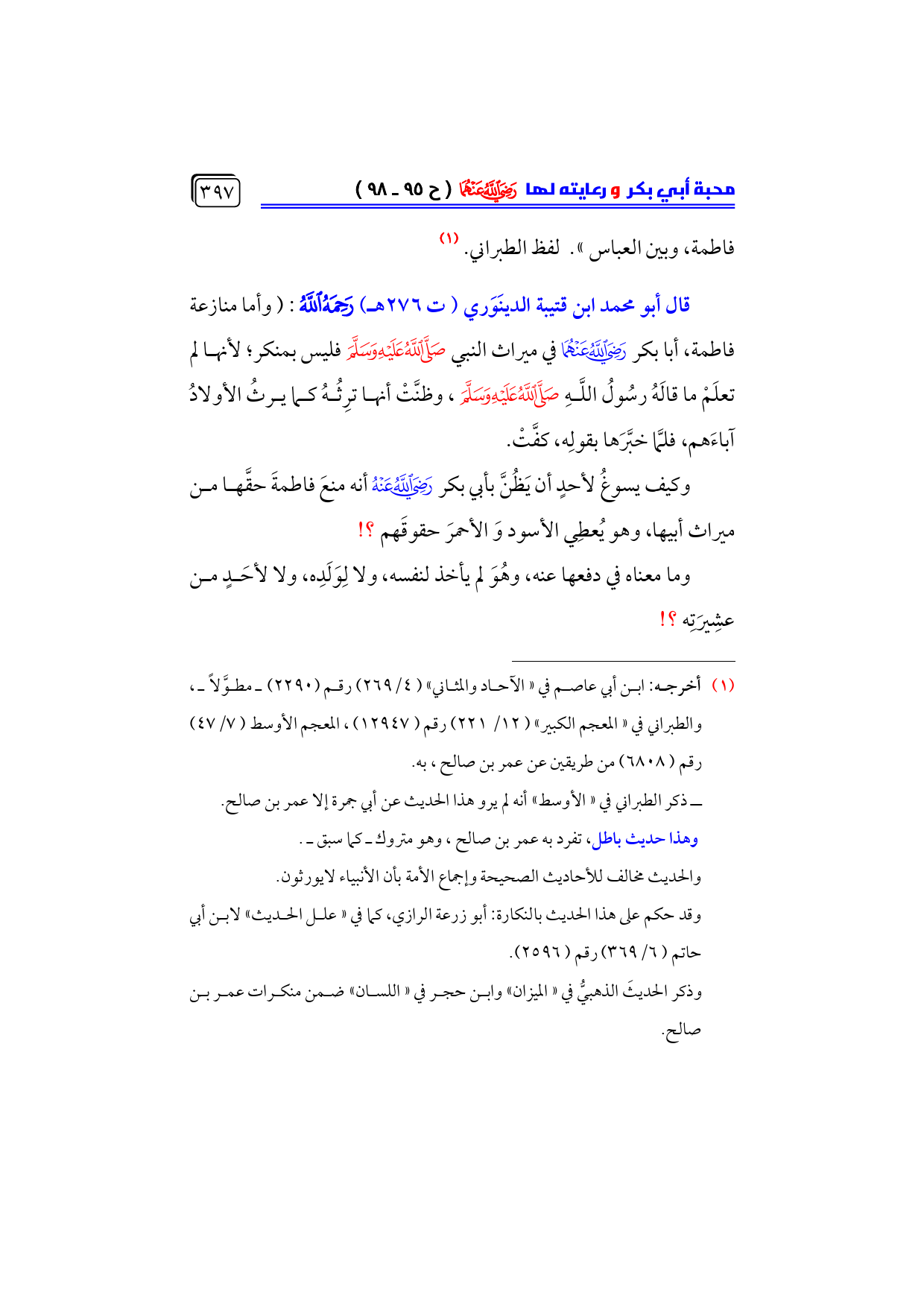 وكيف يسوغُ لأحدٍ أن يَظُنَّ بأبي بكر - رضي الله عنه - أنه منعَ فاطمةَ حقَّها من ميراث أبيها، وهو يُعطِي الأسود وَالأحمرَ حقوقَهم؟ !