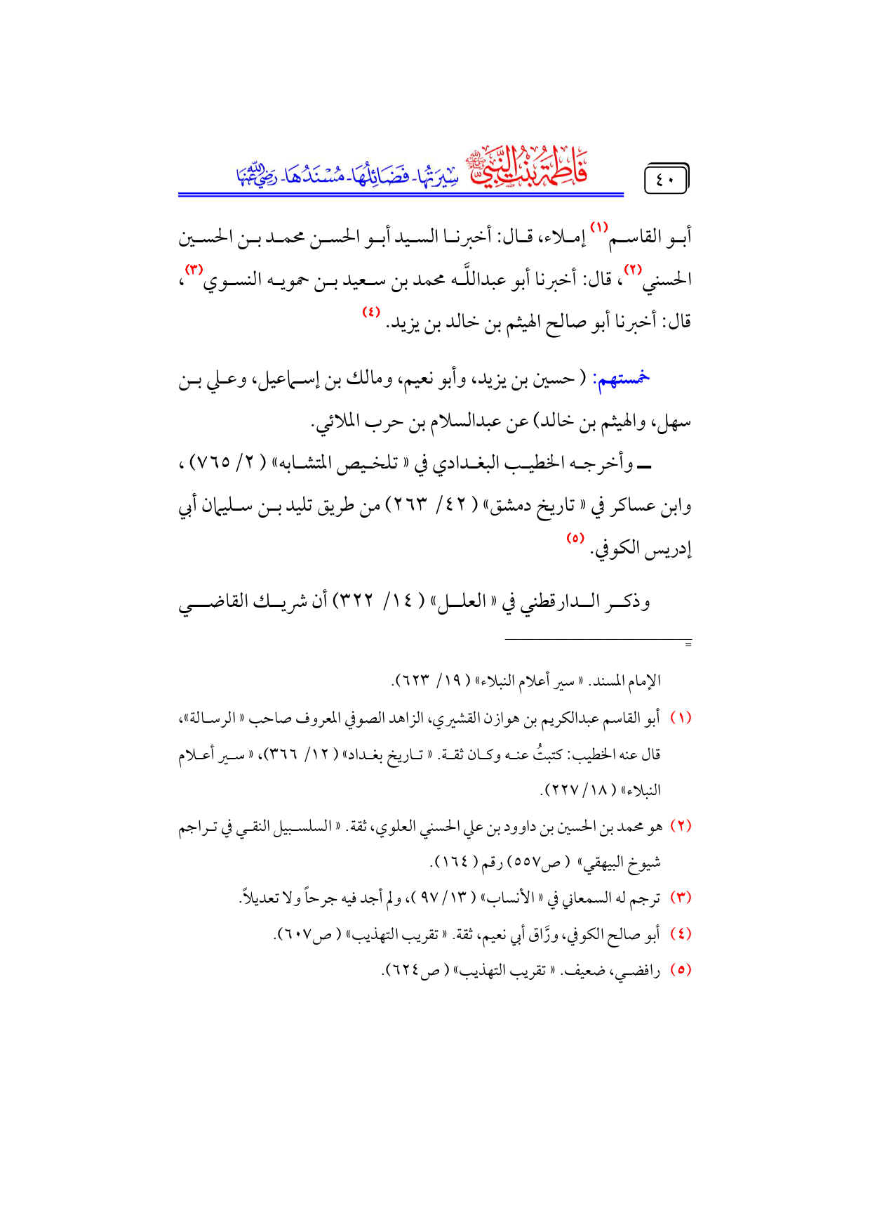 أبو القاسم (¬١) إملاء، قال: أخبرنا السيد أبو الحسن محمد بن الحسين الحسني (¬٢)، قال: أخبرنا أبو عبداللَّه محمد بن سعيد بن حمويه النسوي (¬٣)، قال: أخبرنا أبو صالح الهيثم بن خالد بن يزيد. (¬٤)
