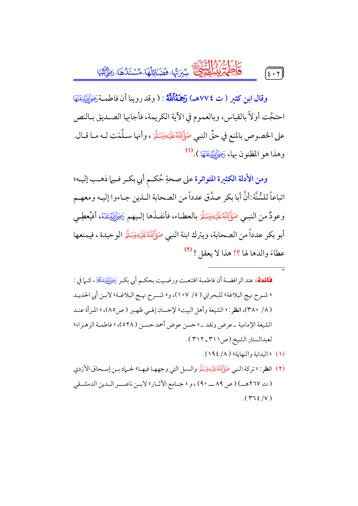 وقال ابن كثير (ت ٧٧٤ هـ) - رحمه الله -: (وقد روينا أن فاطمة - رضي الله عنها - احتجَّت أولاً بالقياس، وبالعموم في الآية الكريمة، فأجابها الصديق بالنص على الخصوص بالمنع في حقِّ النبي - صلى الله عليه وسلم -، وأنها سلَّمَت له ما قال. وهذا هو المظنون بها، - رضي الله عنها -). (¬١)