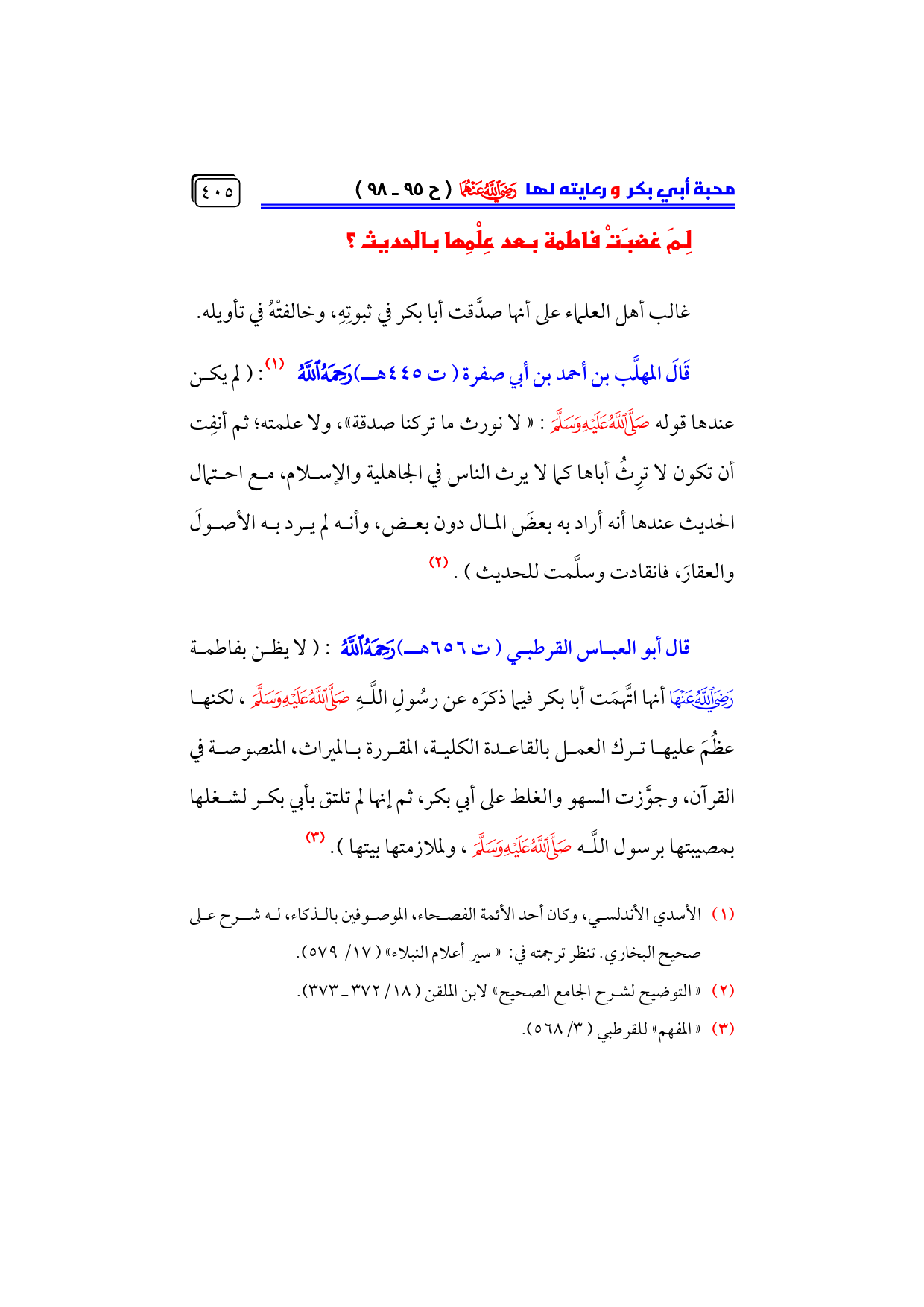 قال أبو العباس القرطبي (ت ٦٥٦ هـ) - رحمه الله -: (لا يظن بفاطمة - رضي الله عنها - أنها اتَّهمَت أبا بكر فيما ذكرَه عن رسُولِ اللَّهِ - صلى الله عليه وسلم -، لكنها عظُمَ عليها ترك العمل بالقاعدة الكلية، المقررة بالميراث، المنصوصة في القرآن، وجوَّزت السهو والغلط على أبي بكر، ثم إنها لم تلتق بأبي بكر لشغلها بمصيبتها برسول اللَّه - صلى الله عليه وسلم -، ولملازمتها بيتها). (¬٣)