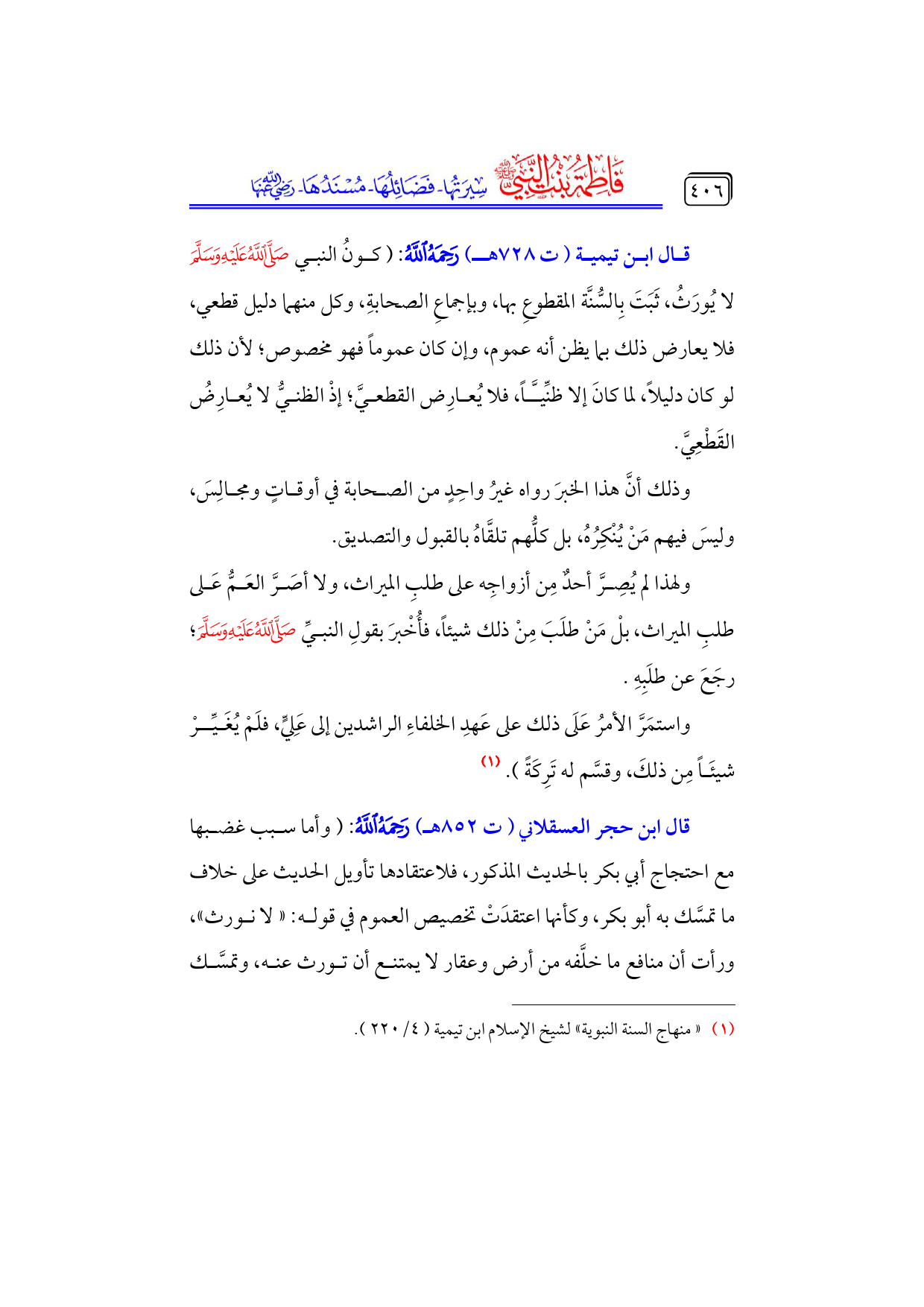 ولهذا لم يُصِرَّ أحدٌ مِن أزواجِه على طلبِ الميراث، ولا أصَرَّ العَمُّ عَلى طلبِ الميراث، بلْ مَنْ طلَبَ مِنْ ذلك شيئاً، فأُخْبرَ بقولِ النبيِّ - صلى الله عليه وسلم -؛ رجَعَ عن طلَبِهِ.