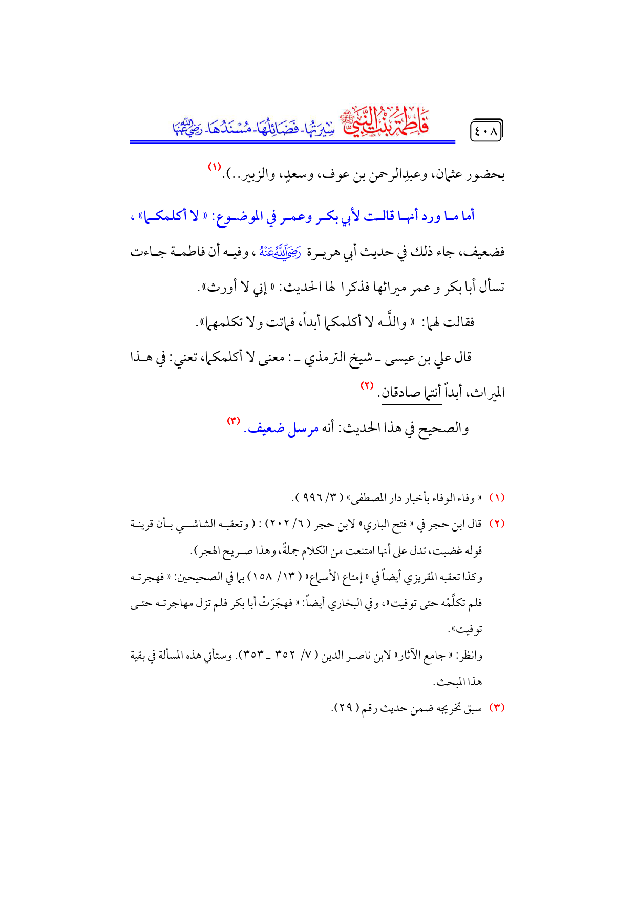 أما ما ورد أنها قالت لأبي بكر وعمر في الموضوع: «لا أكلمكما»، فضعيف، جاء ذلك في حديث أبي هريرة - رضي الله عنه -، وفيه أن فاطمة جاءت تسأل أبا بكر وعمر ميراثها فذكرا لها الحديث: «إني لا أورث».