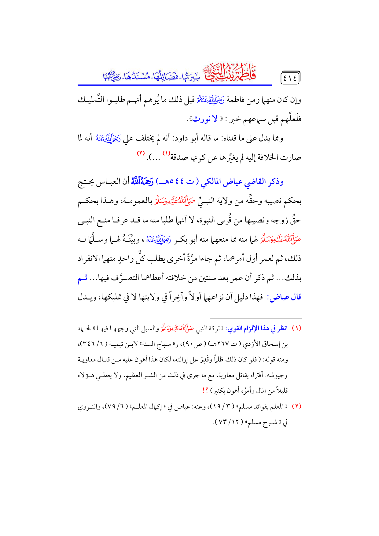 وذكر القاضي عياض المالكي (ت ٥٤٤ هـ) - رحمه الله - أن العباس يحتج بحكم نصيبه وحقِّه من ولاية النبيِّ - صلى الله عليه وسلم - بالعمومة، وهذا بحكم حقِّ زوجه ونصيبها من قُربى النبوة، لا أنهما طلبا منه ما قد عرفا منع النبى - صلى الله عليه وسلم - لهما منه مما منعهما منه أبو بكر - رضي الله عنه -، وبيَّنَهُ لهما وسلَّمَا له ذلك، ثم لعمر أول أمرهما، ثم جاءا مرَّةً أخرى يطلب كلٌّ واحدٍ منهما الانفراد بذلك ... ثم ذكر أن عمر بعد سنتين من خلافته أعطاهما التصرَّف فيها ... ثم قال عياض: فهذا دليل أن نزاعهما أولاً وآخِراً في ولايتها لا في تمليكها، ويدل