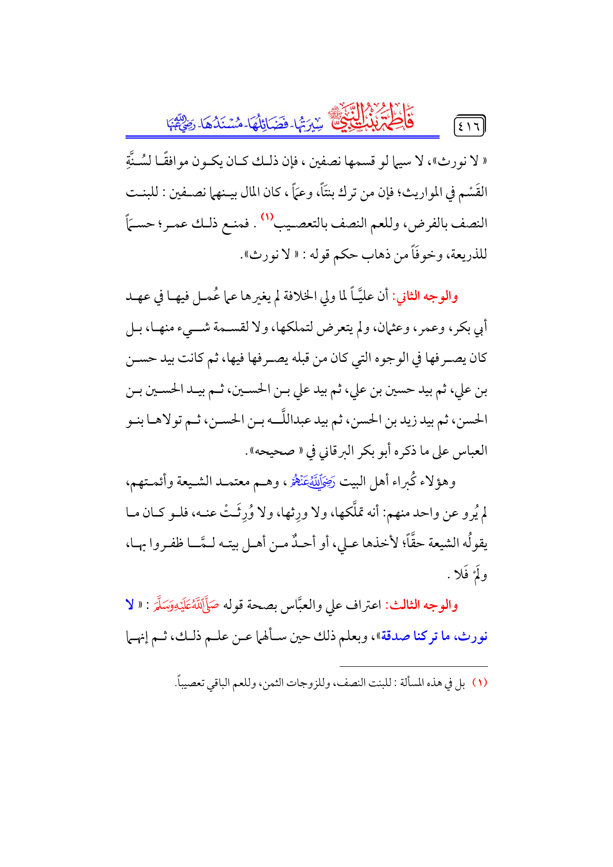 والوجه الثاني: أن عليَّاً لما ولي الخلافة لم يغيرها عما عُمل فيها في عهد أبي بكر، وعمر، وعثمان، ولم يتعرض لتملكها، ولا لقسمة شيء منها، بل كان يصرفها في الوجوه التي كان من قبله يصرفها فيها، ثم كانت بيد حسن بن علي، ثم بيد حسين بن علي، ثم بيد علي بن الحسين، ثم بيد الحسين بن الحسن، ثم بيد زيد بن الحسن، ثم بيد عبداللَّه بن الحسن، ثم تولاها بنو العباس على ما ذكره أبو بكر البرقاني في «صحيحه».