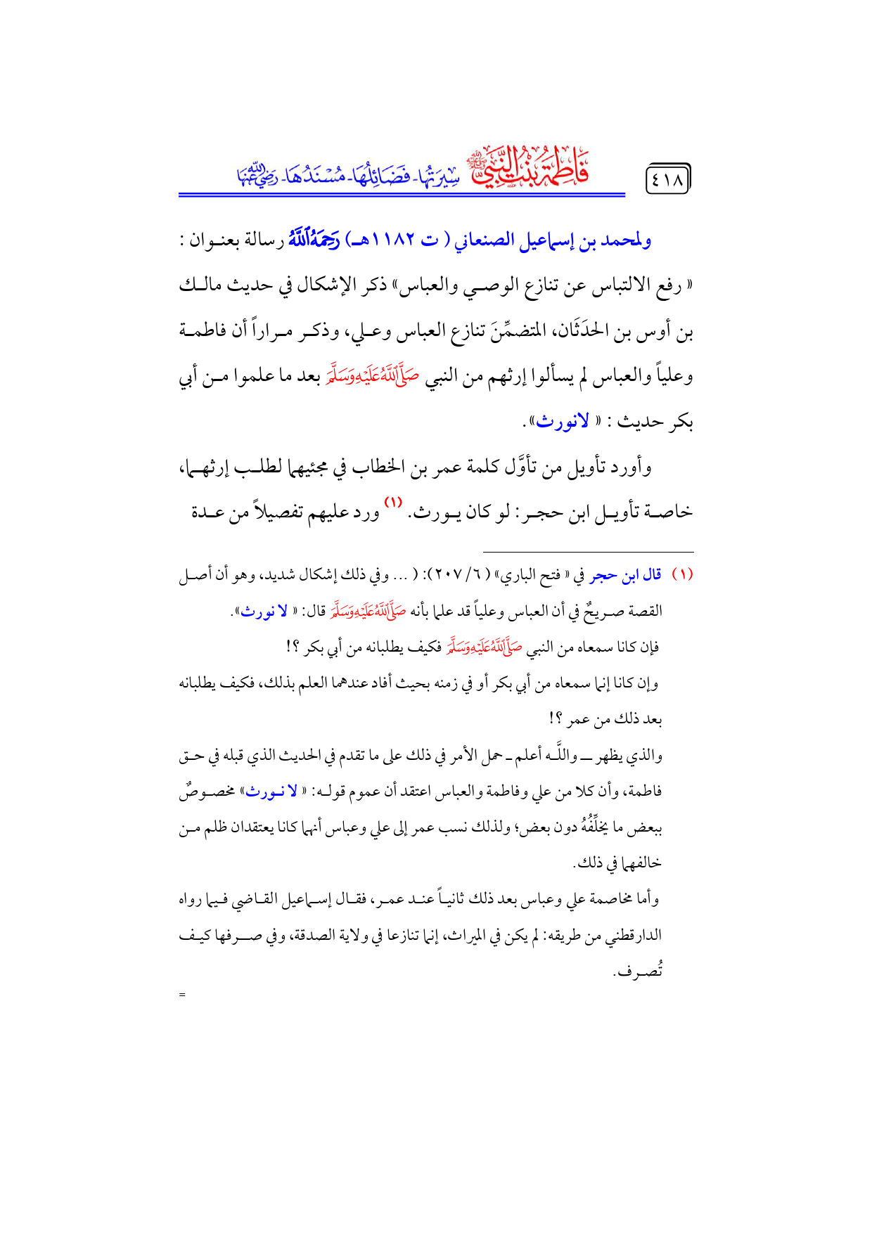 ولمحمد بن إسماعيل الصنعاني (ت ١١٨٢ هـ) - رحمه الله - رسالة بعنوان: «رفع الالتباس عن تنازع الوصي والعباس» ذكر الإشكال في حديث مالك بن أوس بن الحدَثَان، المتضمِّنَ تنازع العباس وعلي، وذكر مراراً أن فاطمة وعلياً والعباس لم يسألوا إرثهم من النبي - صلى الله عليه وسلم - بعد ما علموا من أبي بكر حديث: «لانورث».