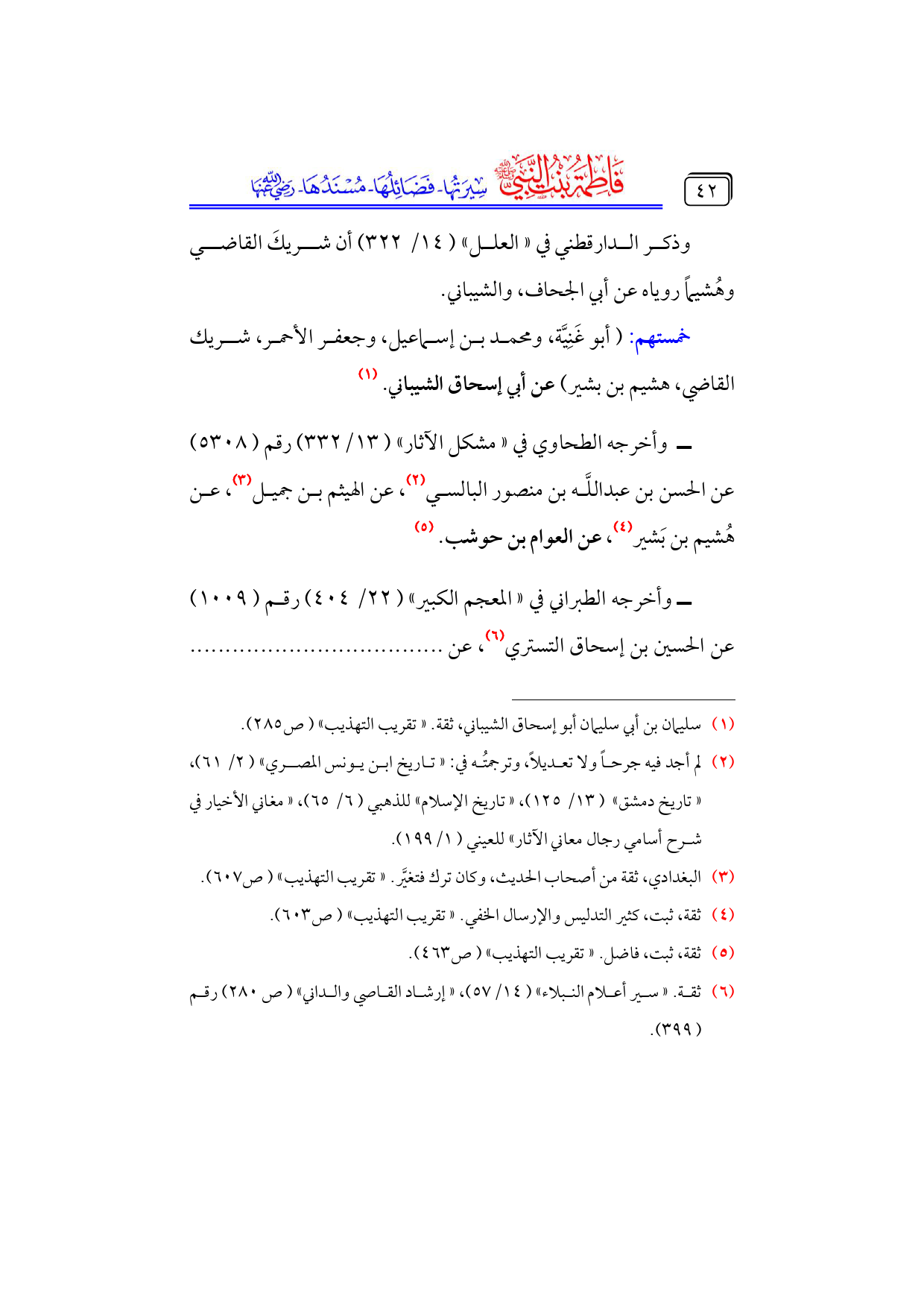 ــ وأخرجه الطحاوي في «مشكل الآثار» (١٣/ ٣٣٢) رقم (٥٣٠٨) عن الحسن بن عبداللَّه بن منصور البالسي (¬٢)، عن الهيثم بن جميل (¬٣)، عن هُشيم بن بَشير (¬٤)، عن العوام بن حوشب. (¬٥)