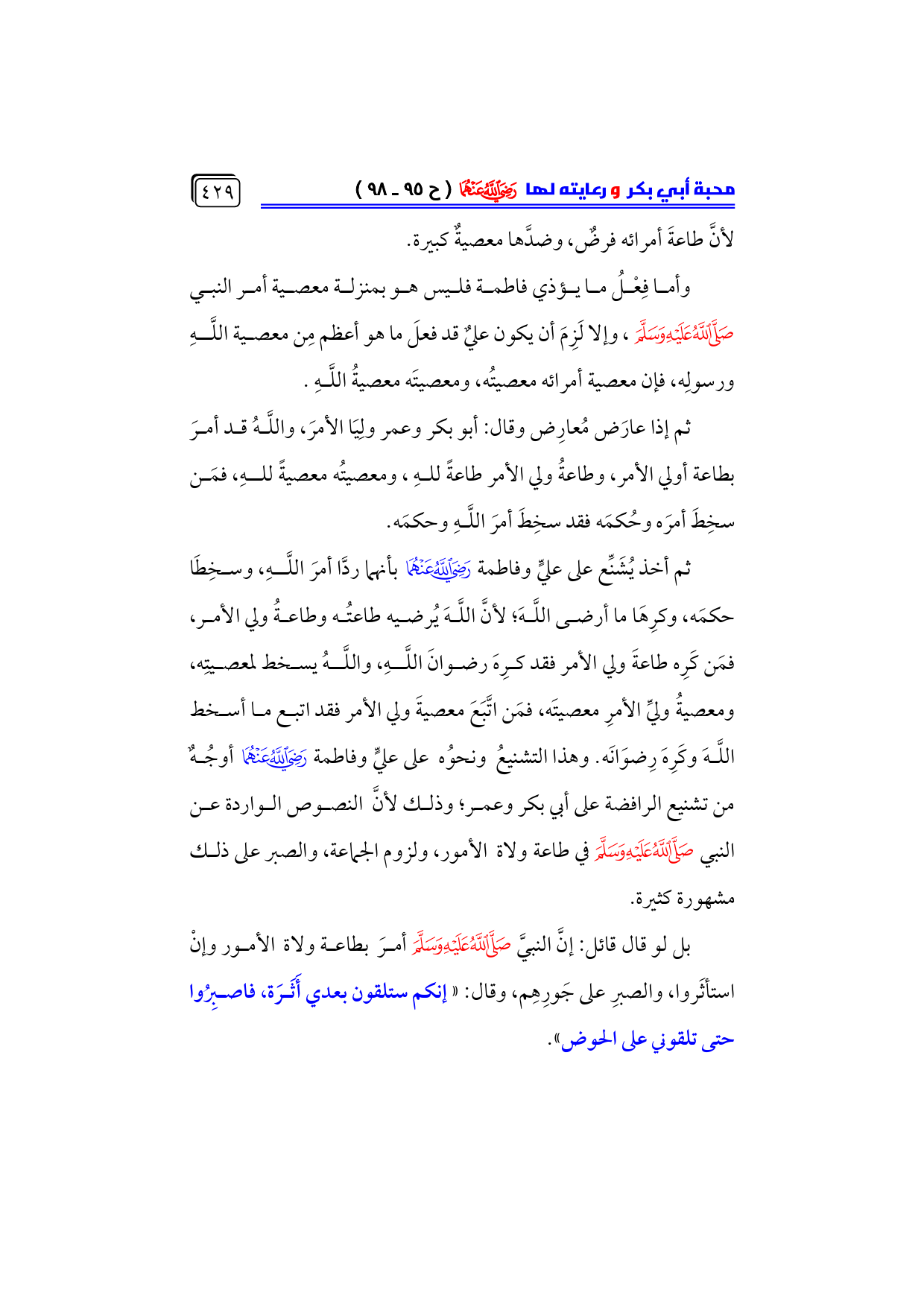 ثم أخذ يُشَنِّع على عليٍّ وفاطمة - رضي الله عنهما - بأنهما ردَّا أمرَ اللَّهِ، وسخِطَا حكمَه، وكرِهَا ما أرضى اللَّهَ؛ لأنَّ اللَّهَ يُرضيه طاعتُه وطاعةُ ولي الأمر، فمَن كَرِه طاعةَ ولي الأمر فقد كرِهَ رضوانَ اللَّهِ، واللَّهُ يسخط لمعصيتِه، ومعصيةُ وليِّ الأمرِ معصيتَه، فمَن اتَّبَعَ معصيةَ ولي الأمر فقد اتبع ما أسخط اللَّهَ وكَرِهَ رِضوَانَه. وهذا التشنيعُ ونحوُه على عليٍّ وفاطمة - رضي الله عنهما - أوجُهٌ من تشنيع الرافضة على أبي بكر وعمر؛ وذلك لأنَّ النصوص الواردة عن النبي - صلى الله عليه وسلم - في طاعة ولاة الأمور، ولزوم الجماعة، والصبر على ذلك مشهورة كثيرة.