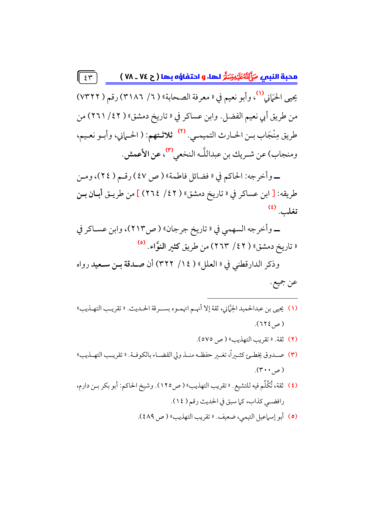 (¬٤) ثقة، تُكُلِّم فيه للتشيع. «تقريب التهذيب» (ص ١٢٥). وشيخ الحاكم: أبو بكر بن دارم، رافضي كذاب، كما سبق في الحديث رقم (١٤).