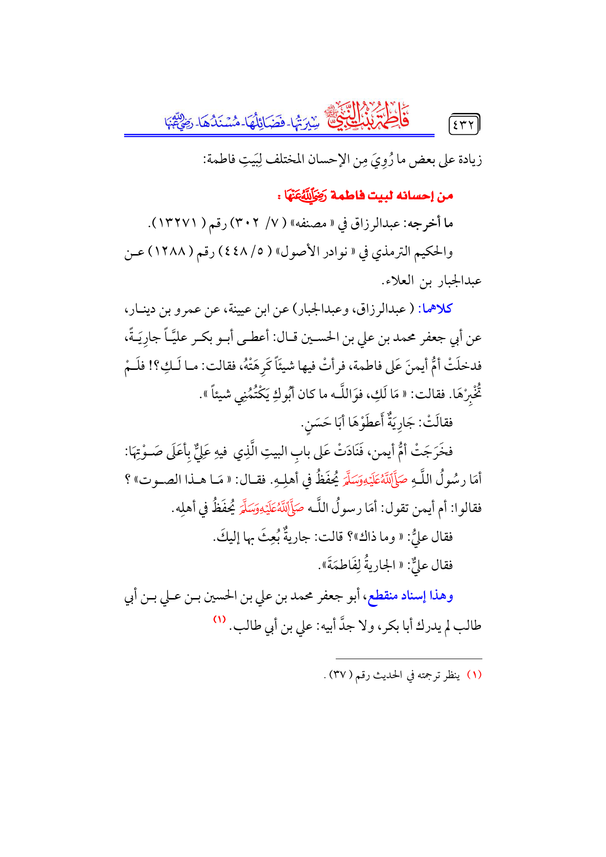 كتاب فاطمة بنت النبي - صلى الله عليه وسلم - سيرتها، فضائلها، مسندها - رضي الله عنها - (اسم الجزء: 4)