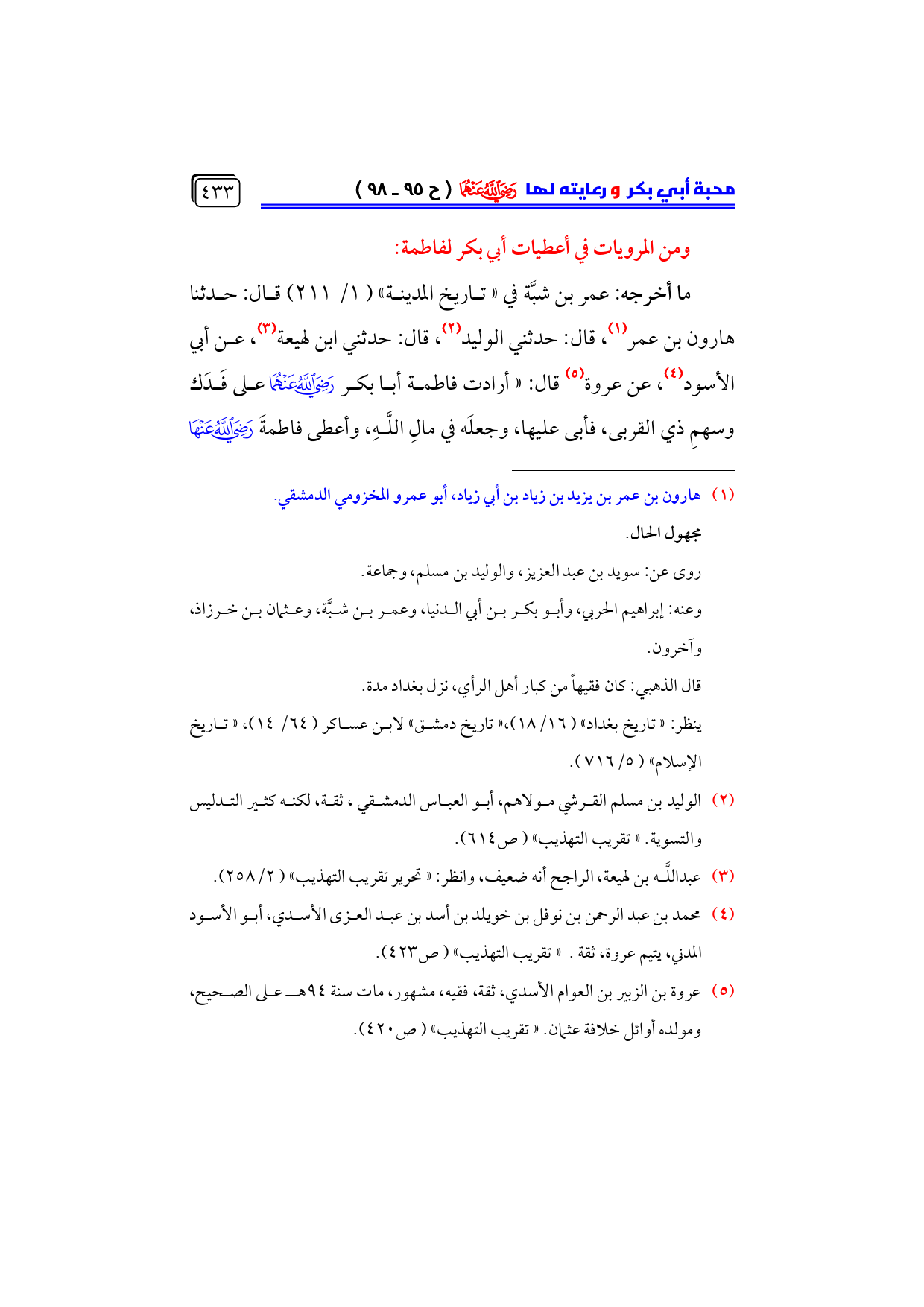 ما أخرجه: عمر بن شبَّة في «تاريخ المدينة» (١/ ٢١١) قال: حدثنا هارون بن عمر (¬١)، قال: حدثني الوليد (¬٢)، قال: حدثني ابن لهيعة (¬٣)، عن أبي الأسود (¬٤)، عن عروة (¬٥) قال: «أرادت فاطمة أبا بكر - رضي الله عنهما - على فَدَك وسهمِ ذي القربى، فأبى عليها، وجعلَه في مالِ اللَّهِ، وأعطى فاطمةَ - رضي الله عنها -